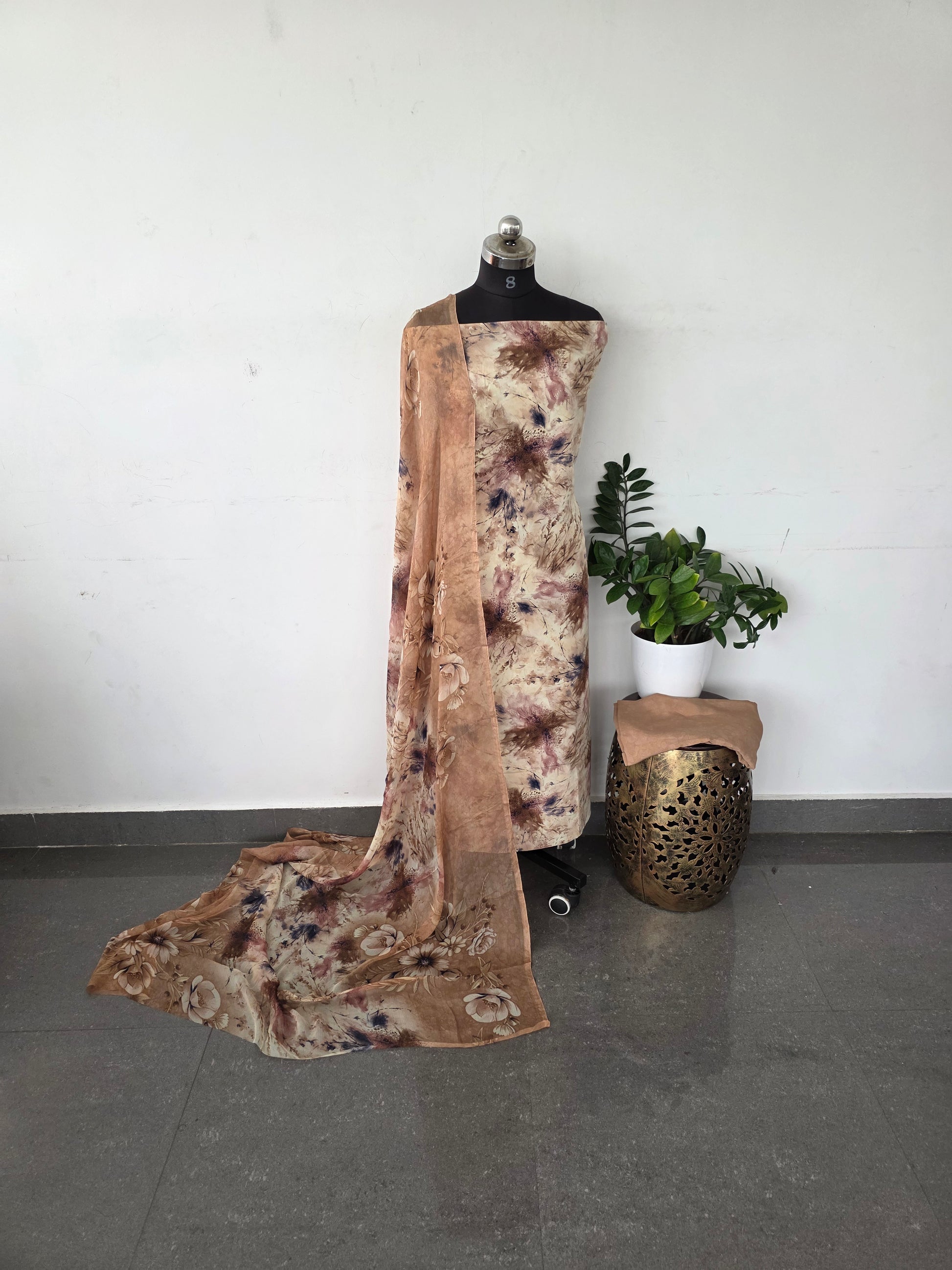 This set includes a premium French crepe top measuring approximately 2.40 meters, paired with a bottom and dupatta each about 2.25 meters in length.