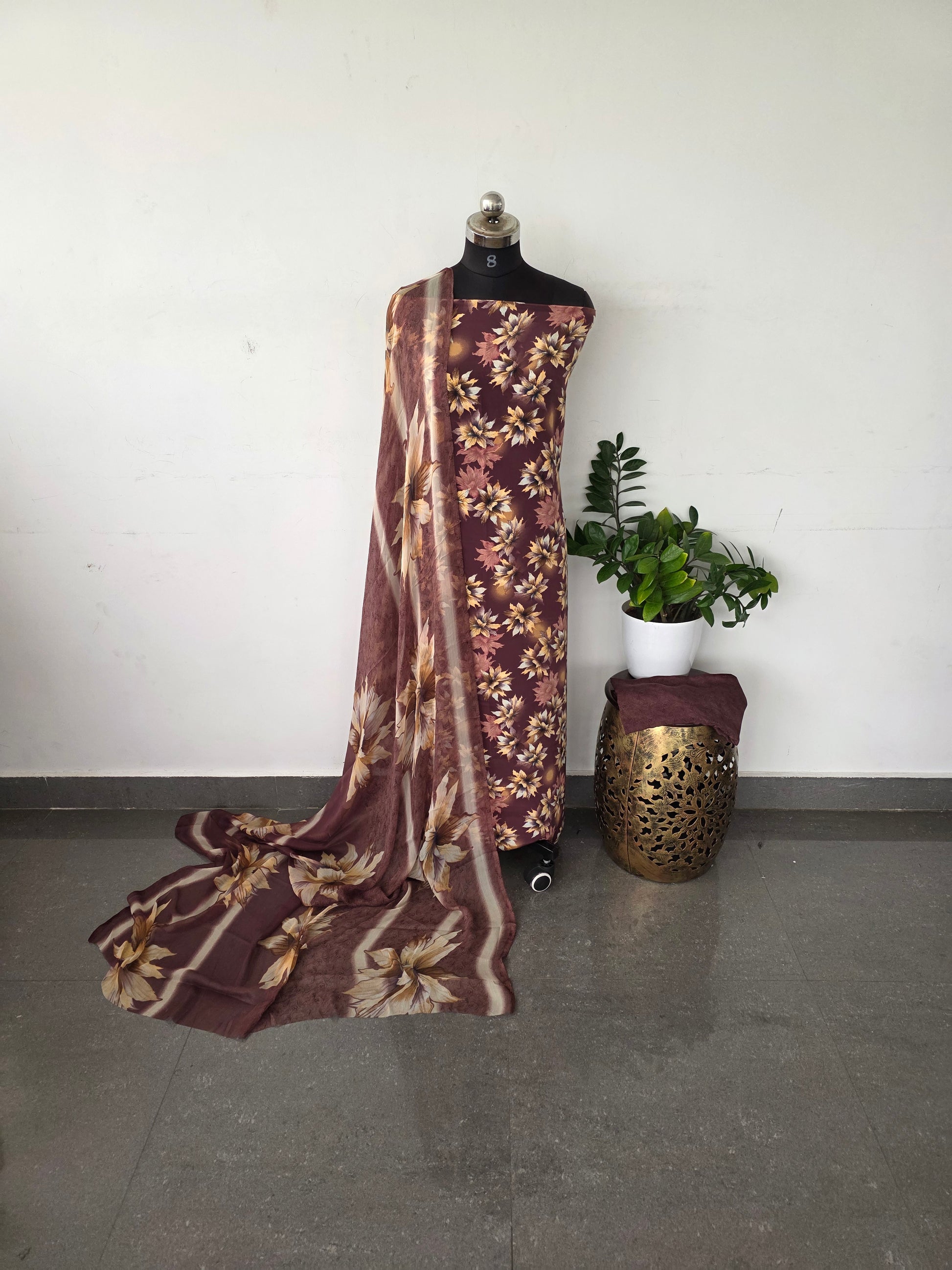 This set includes a premium French crepe top measuring approximately 2.40 meters, paired with a bottom and dupatta each about 2.25 meters in length.