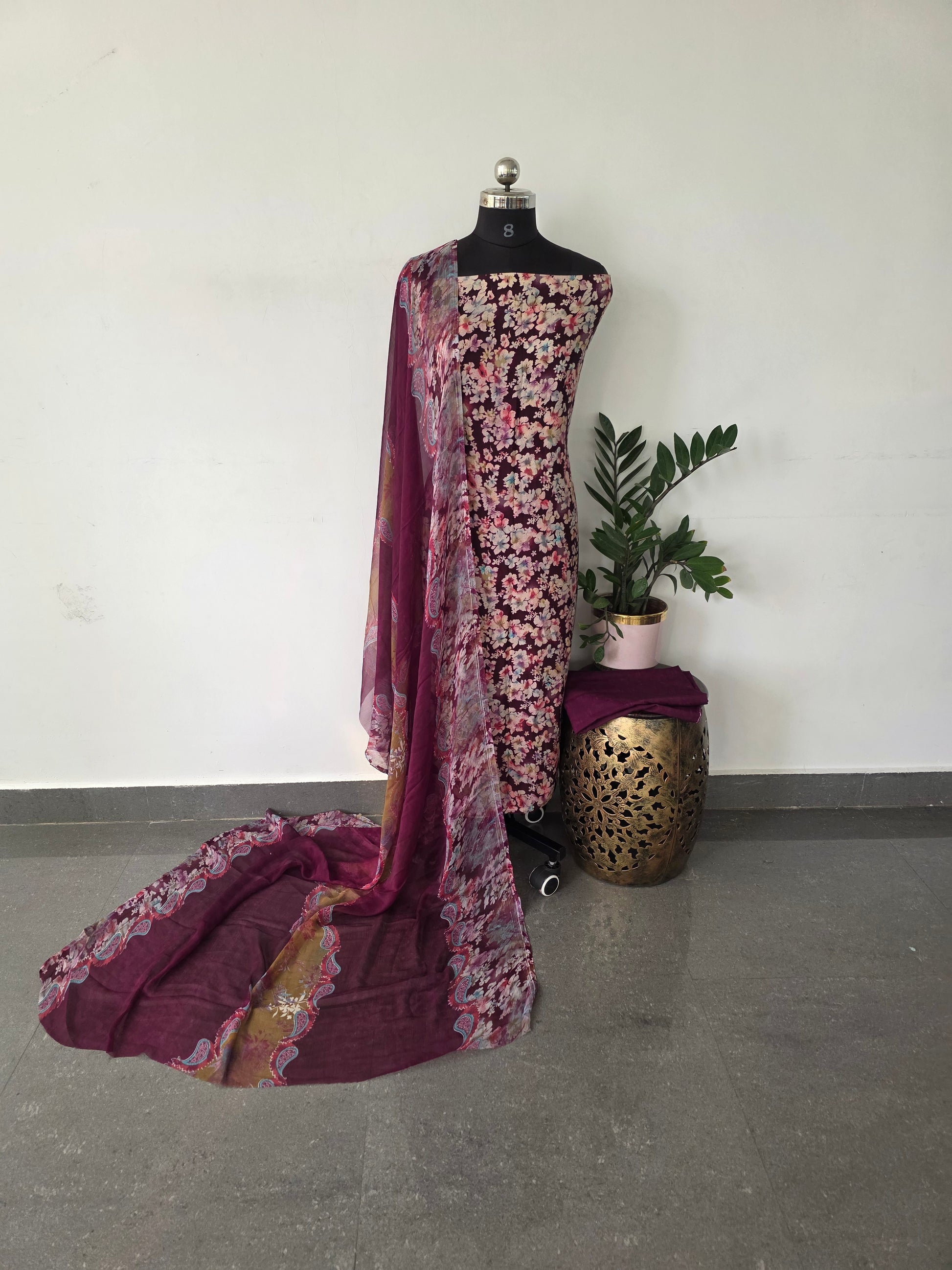 This set includes a premium French crepe top measuring approximately 2.40 meters, paired with a bottom and dupatta each about 2.25 meters in length.