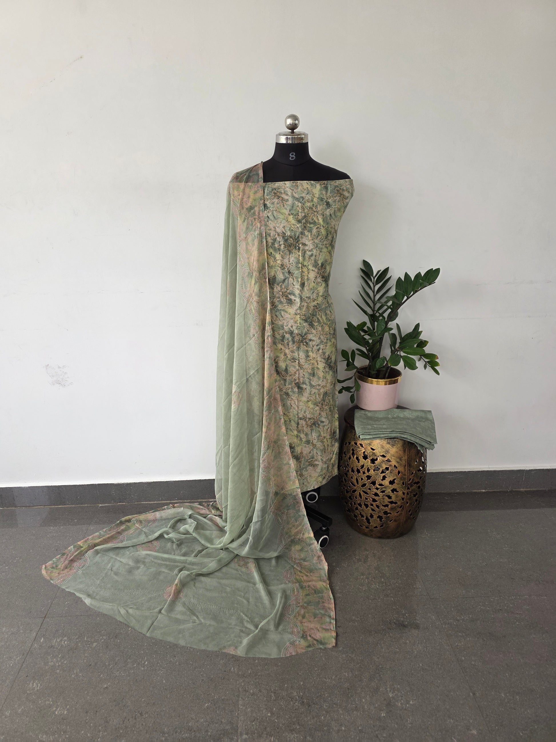 This set includes a premium French crepe top measuring approximately 2.40 meters, paired with a bottom and dupatta each about 2.25 meters in length.