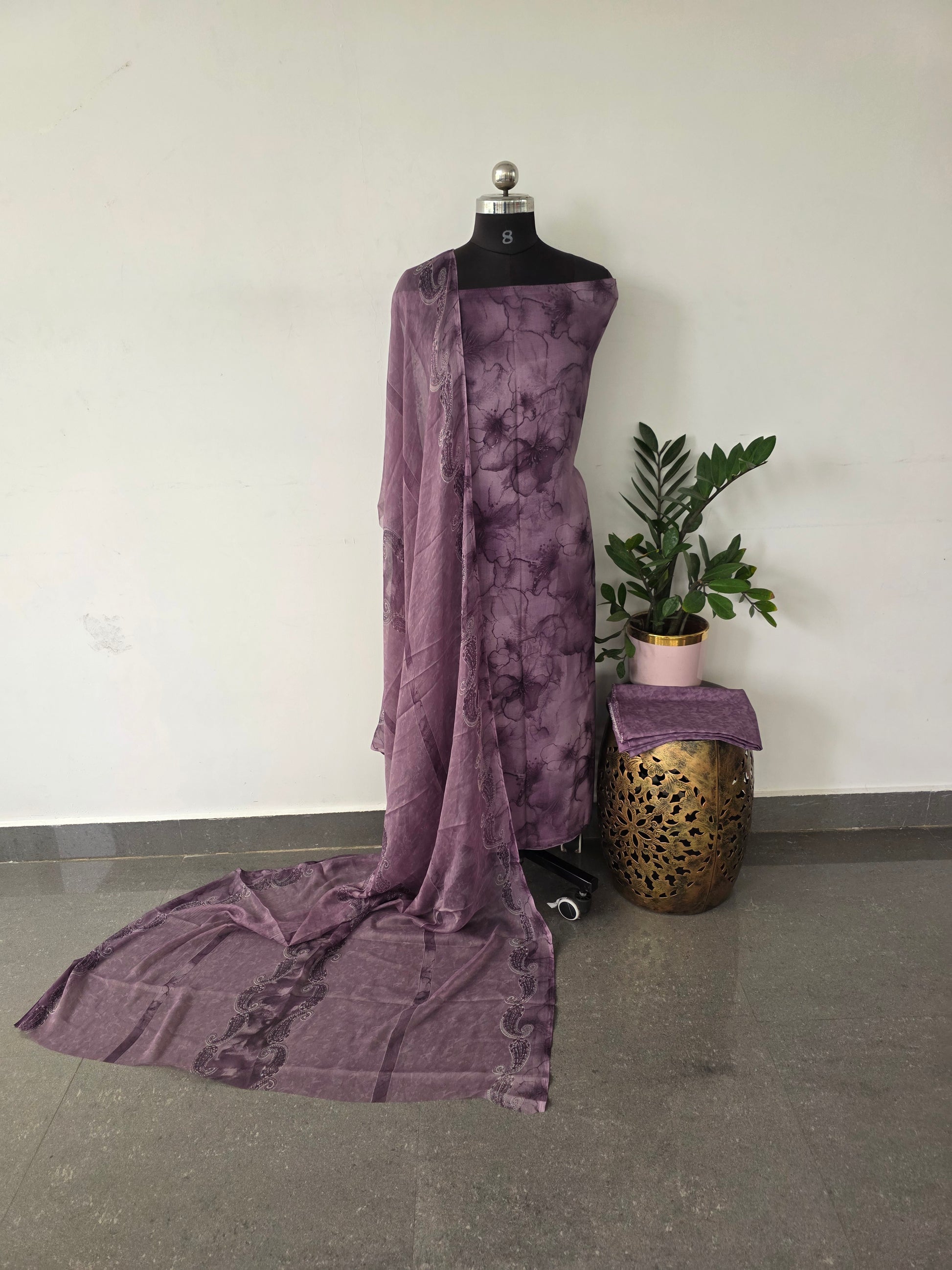 This set includes a premium French crepe top measuring approximately 2.40 meters, paired with a bottom and dupatta each about 2.25 meters in length.