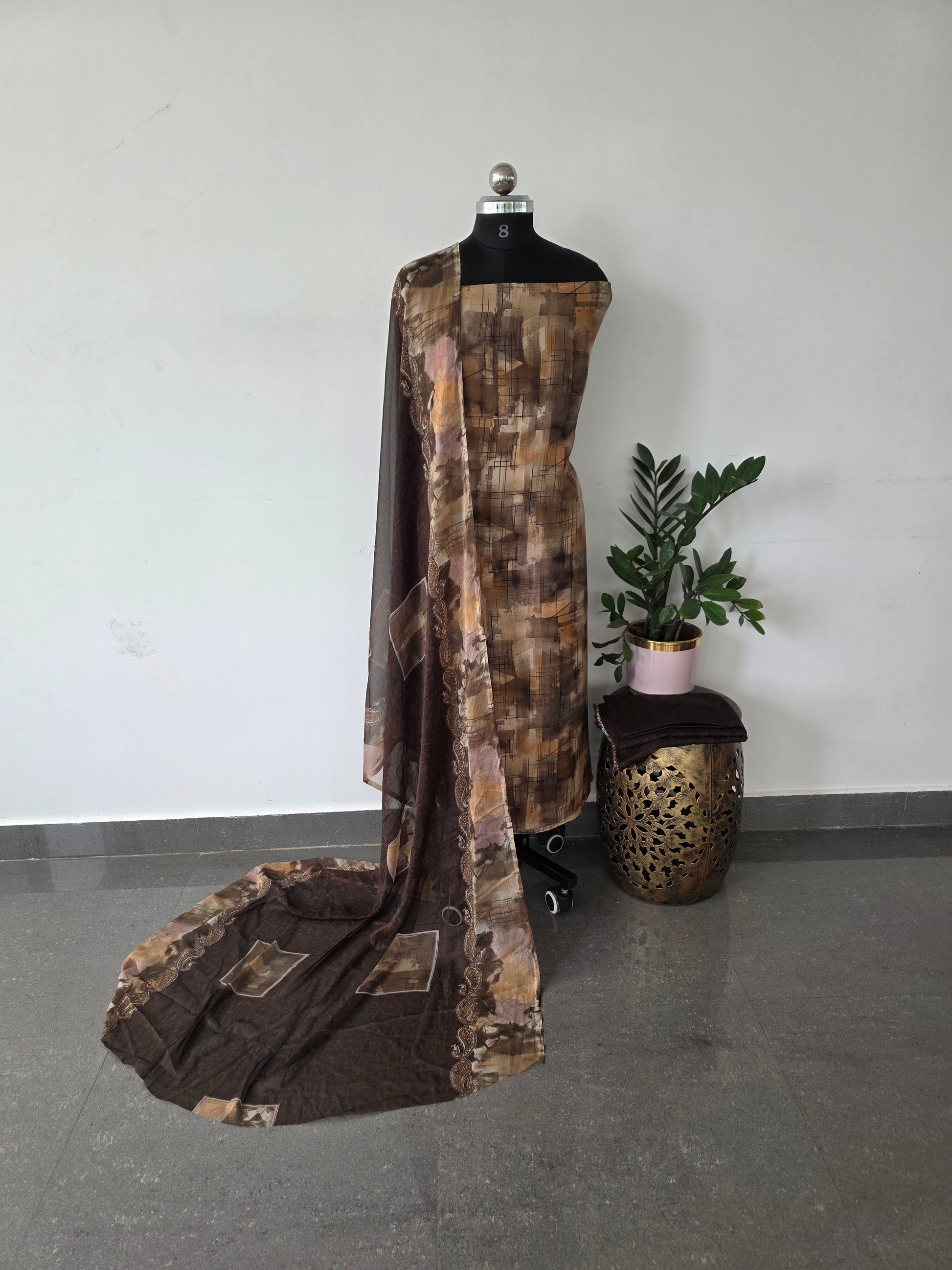 This set includes a premium French crepe top measuring approximately 2.40 meters, paired with a bottom and dupatta each about 2.25 meters in length.