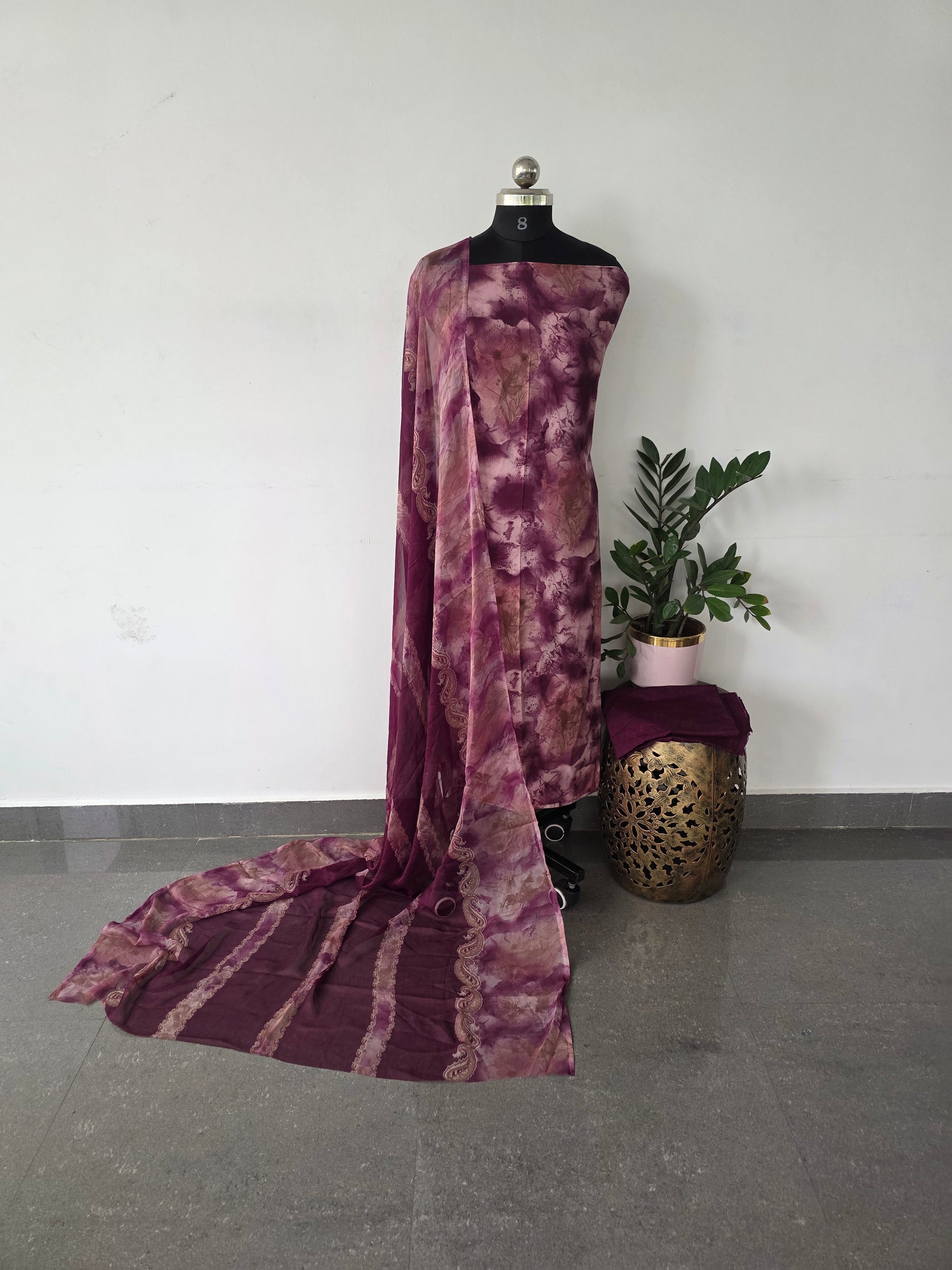 This set includes a premium French crepe top measuring approximately 2.40 meters, paired with a bottom and dupatta each about 2.25 meters in length.