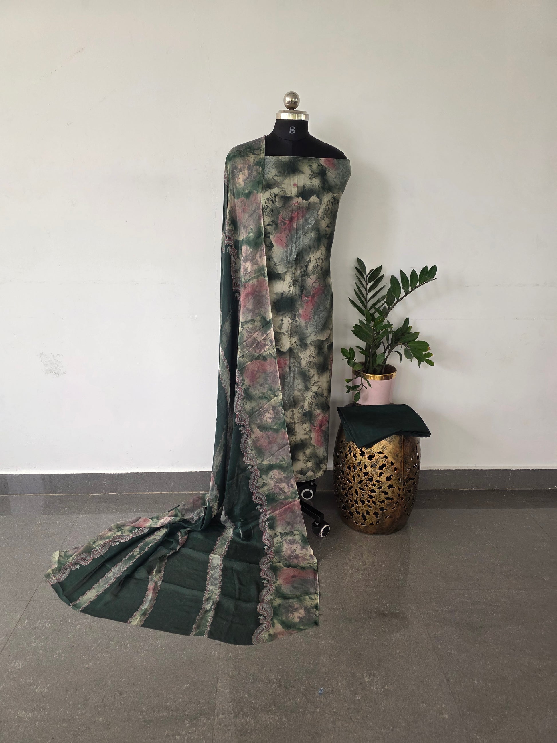This set includes a premium French crepe top measuring approximately 2.40 meters, paired with a bottom and dupatta each about 2.25 meters in length.