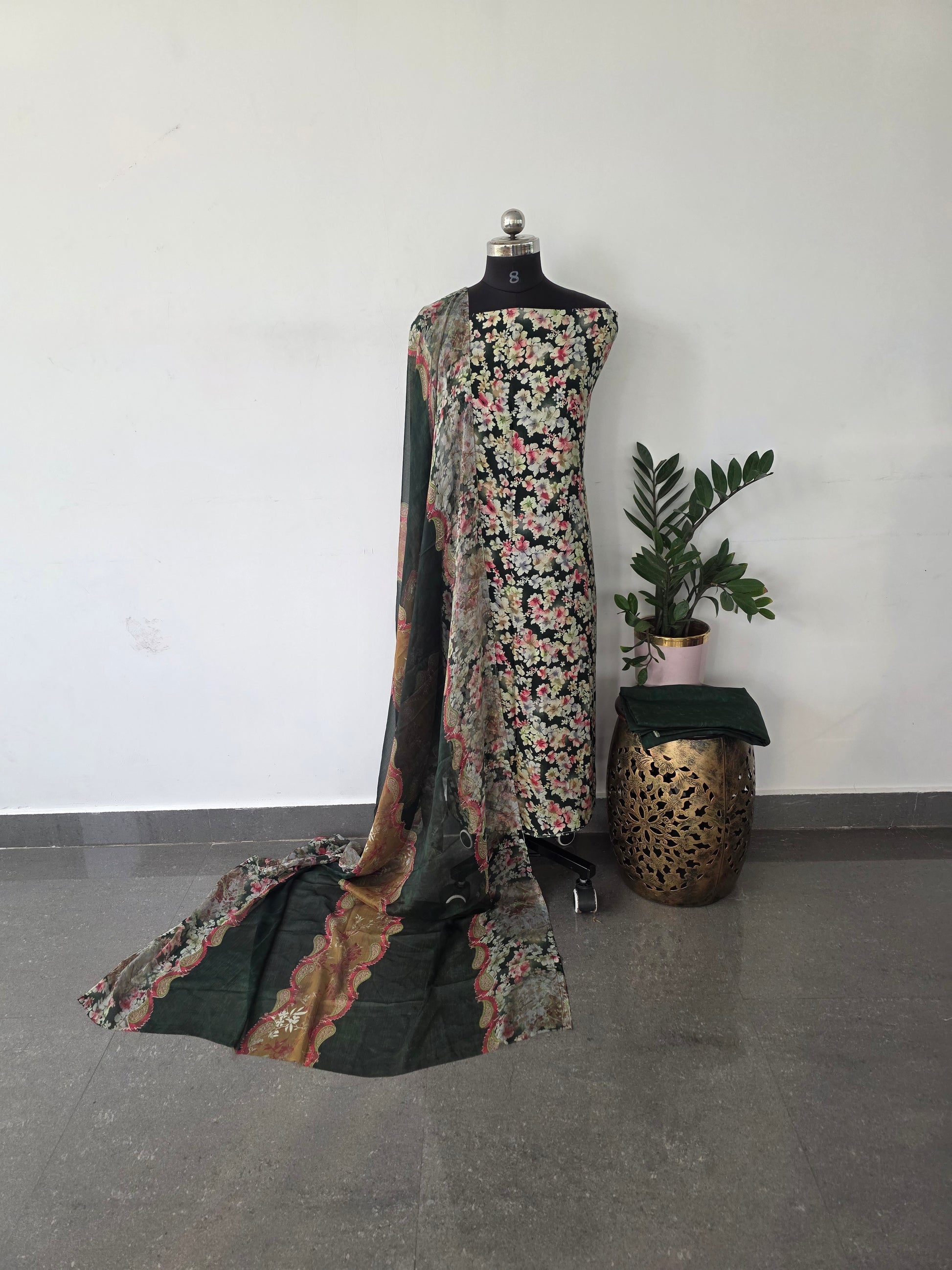This set includes a premium French crepe top measuring approximately 2.40 meters, paired with a bottom and dupatta each about 2.25 meters in length.