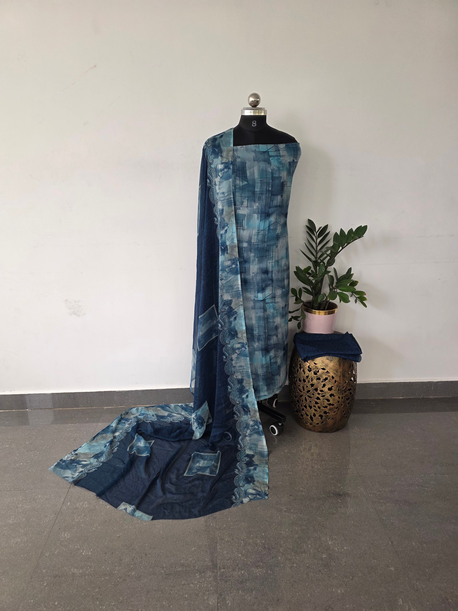 This set includes a premium French crepe top measuring approximately 2.40 meters, paired with a bottom and dupatta each about 2.25 meters in length.
