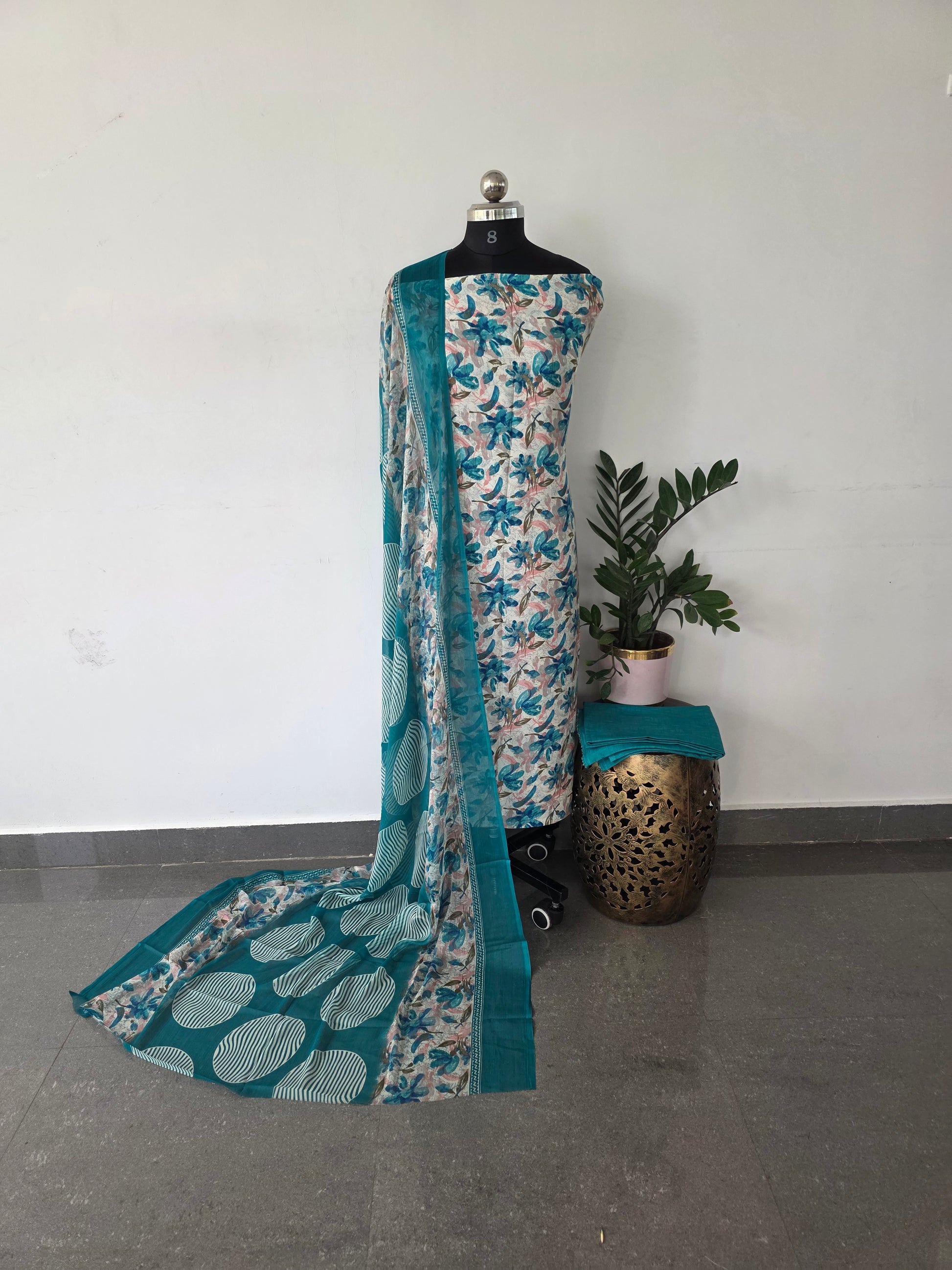 This set includes a premium French crepe top measuring approximately 2.40 meters, paired with a bottom and dupatta each about 2.25 meters in length.