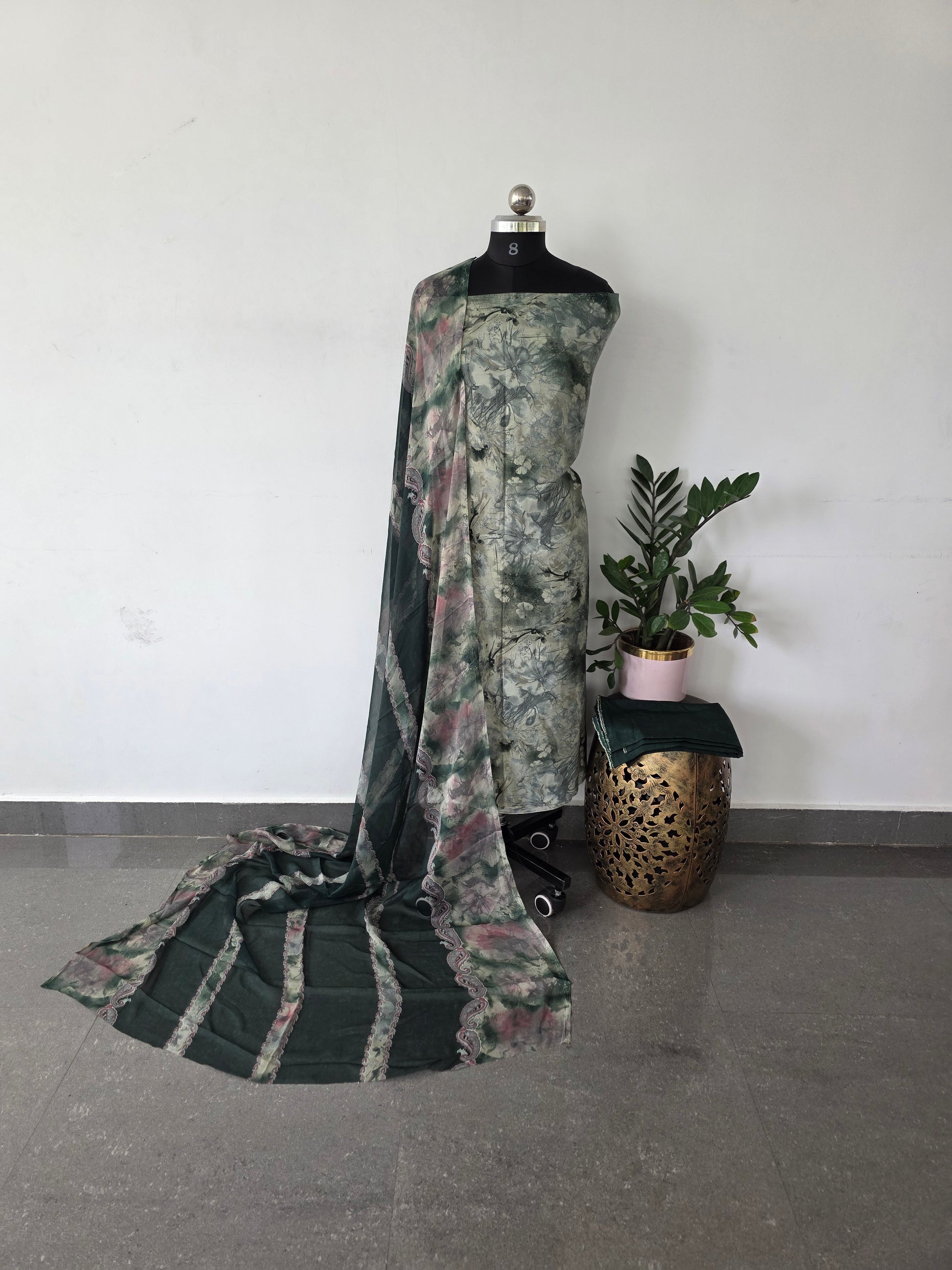 This set includes a premium French crepe top measuring approximately 2.40 meters, paired with a bottom and dupatta each about 2.25 meters in length.