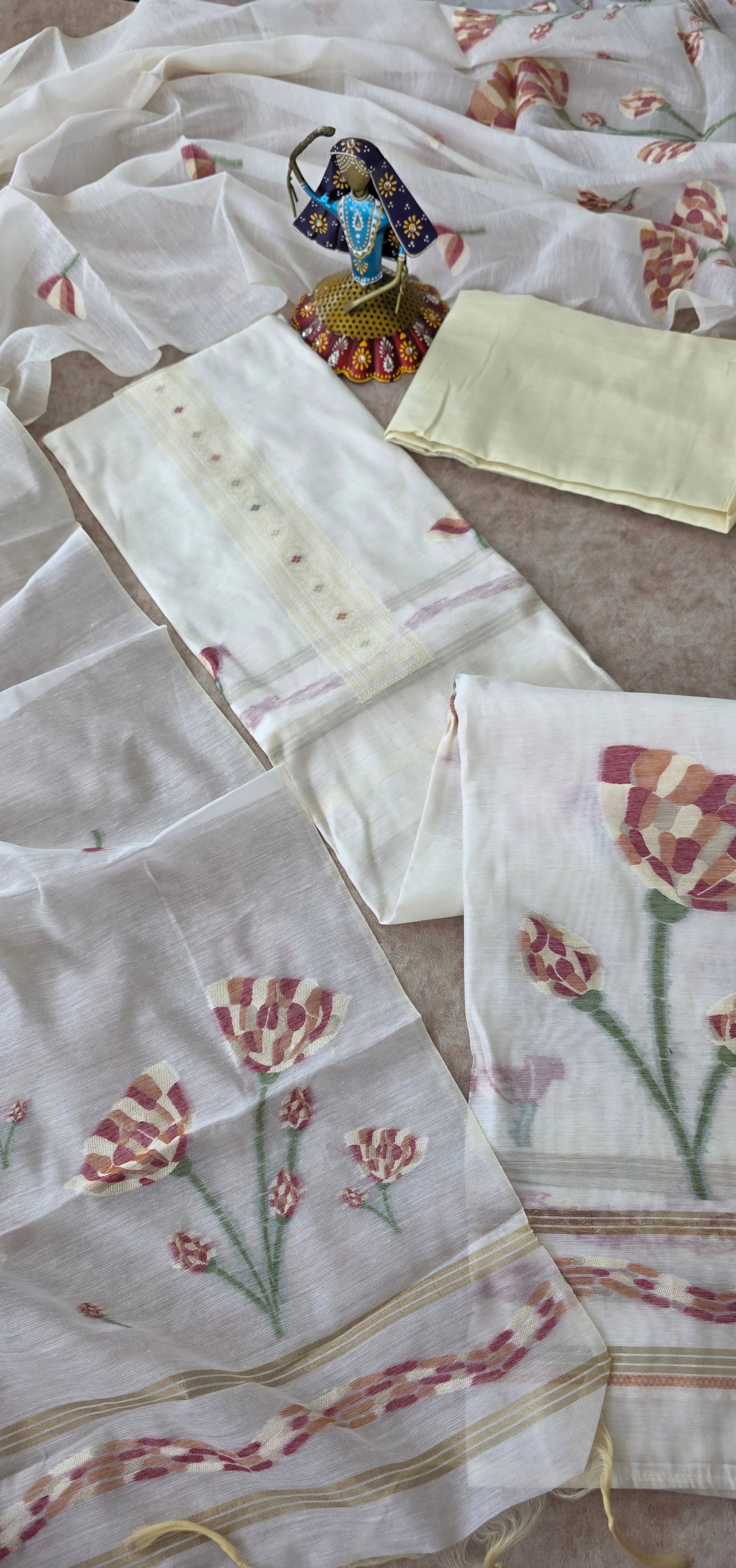 This set features a top crafted from premium cotton adorned with a Jamdani zari border weave, complemented by a bottom in silk. The dupatta is made of high-quality silk cotton, showcasing an intricate Jamdani weave and finished with handcrafted tassels.