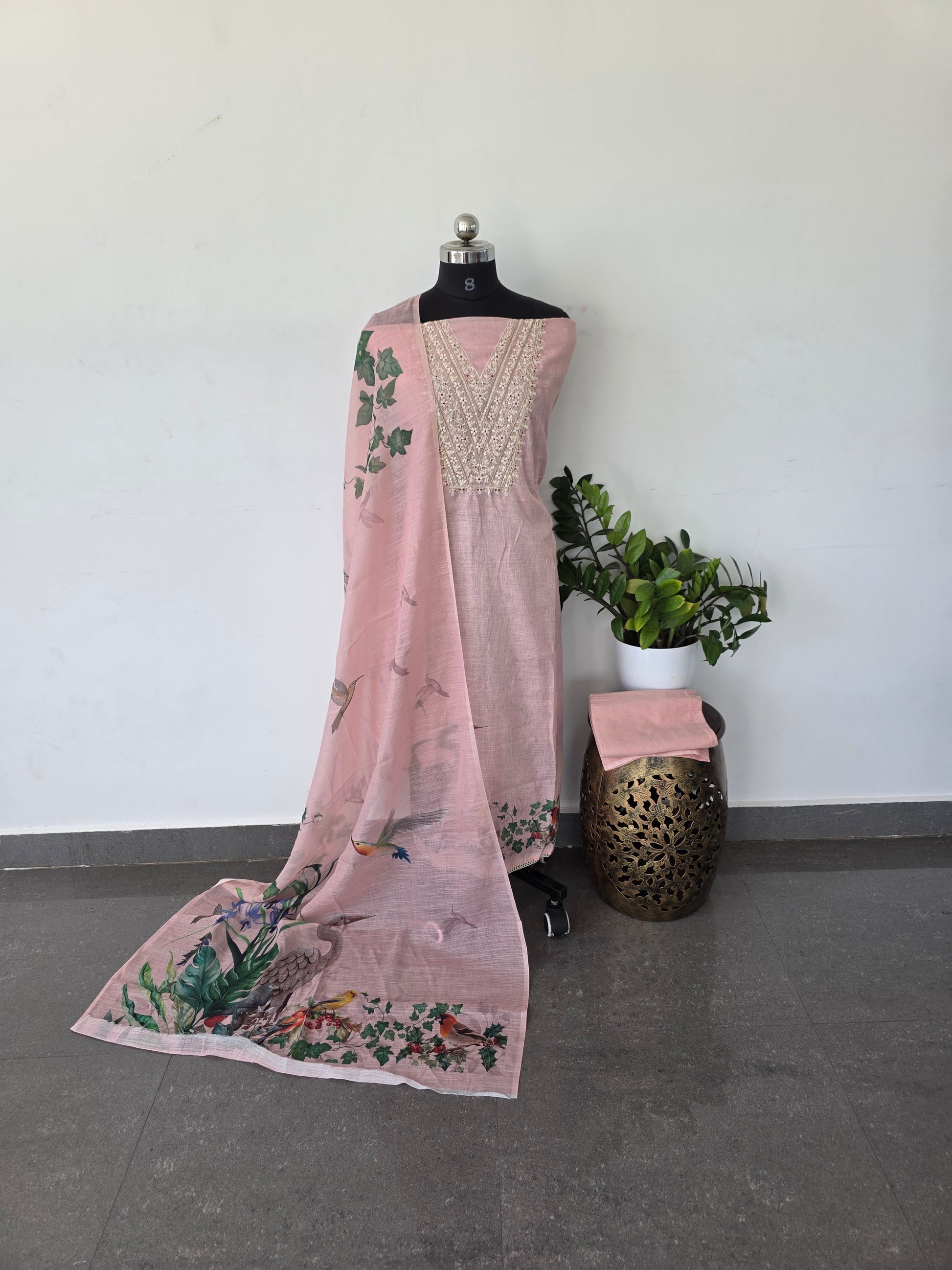 This set features a premium linen cotton top adorned with embroidered birds and a lace neck patch, paired with a cotton bottom. It includes a high-quality digital linen cotton shawl to complete the ensemble.