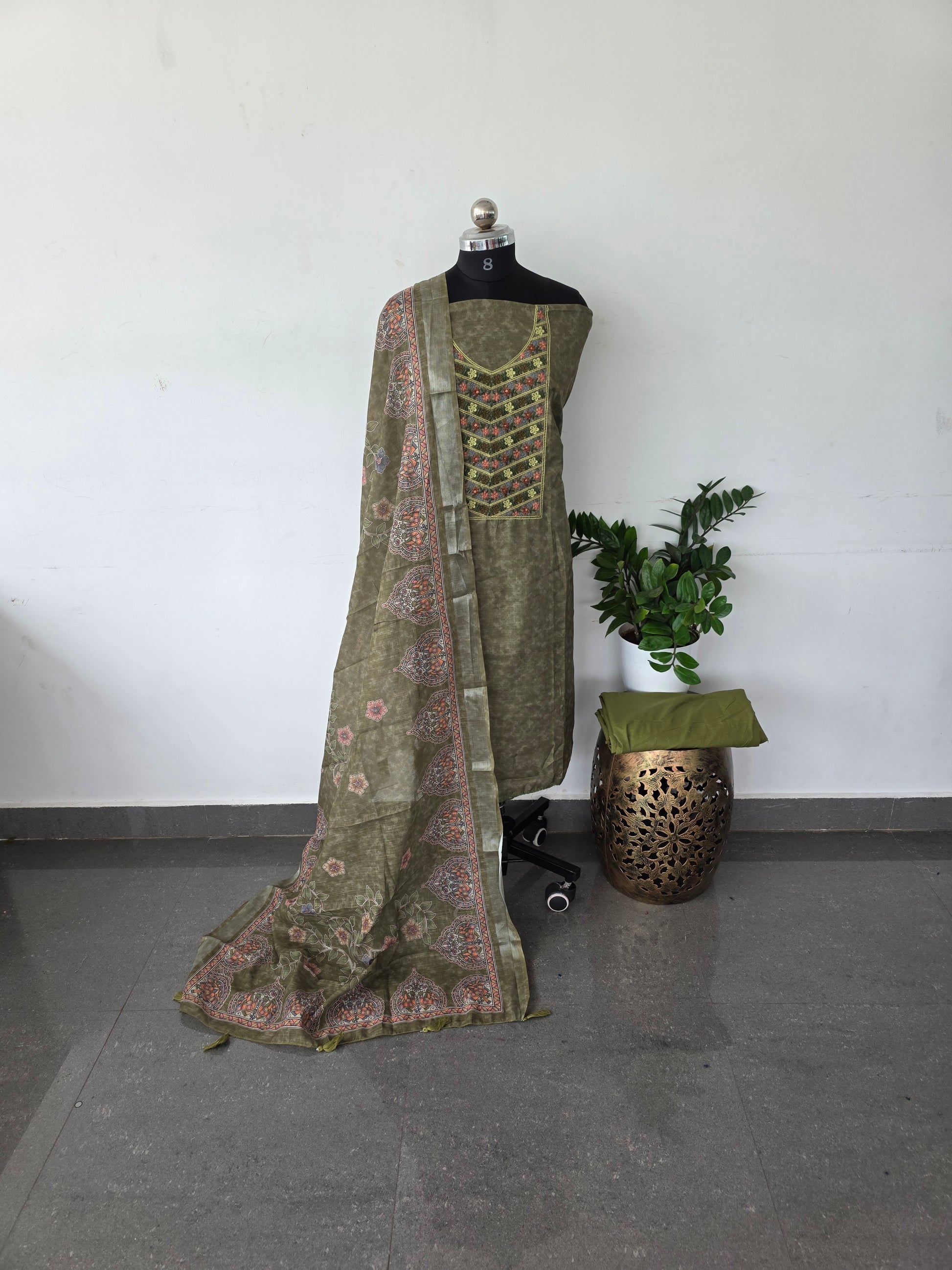 This set features a premium linen cotton top adorned with intricate heavy embroidery and sequin detailing. The bottom is crafted from comfortable santoon fabric, while the dupatta is a high-quality digital silk shawl enhanced with an elegant zari border.