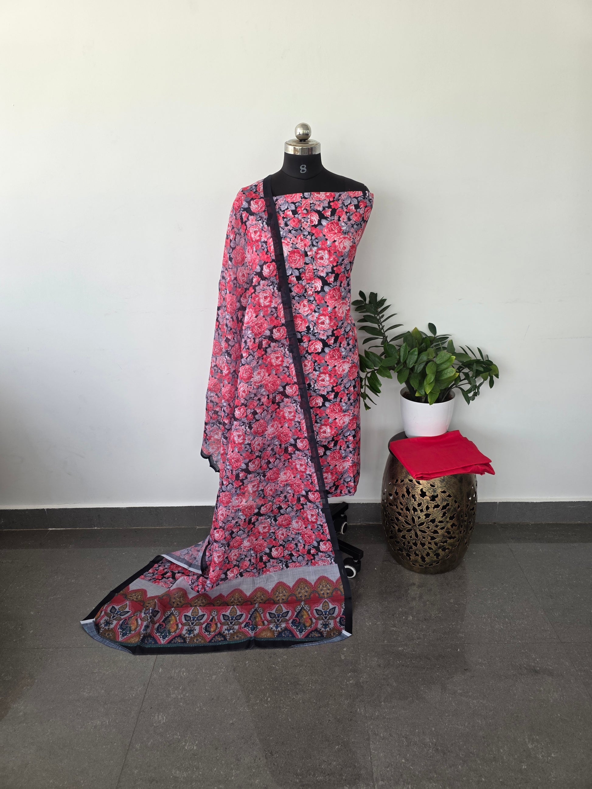 The top is crafted from premium linen cotton measuring 2.5 meters, paired with a bottom and a 2.5-meter premium linen shawl featuring a zari border as the dupatta.