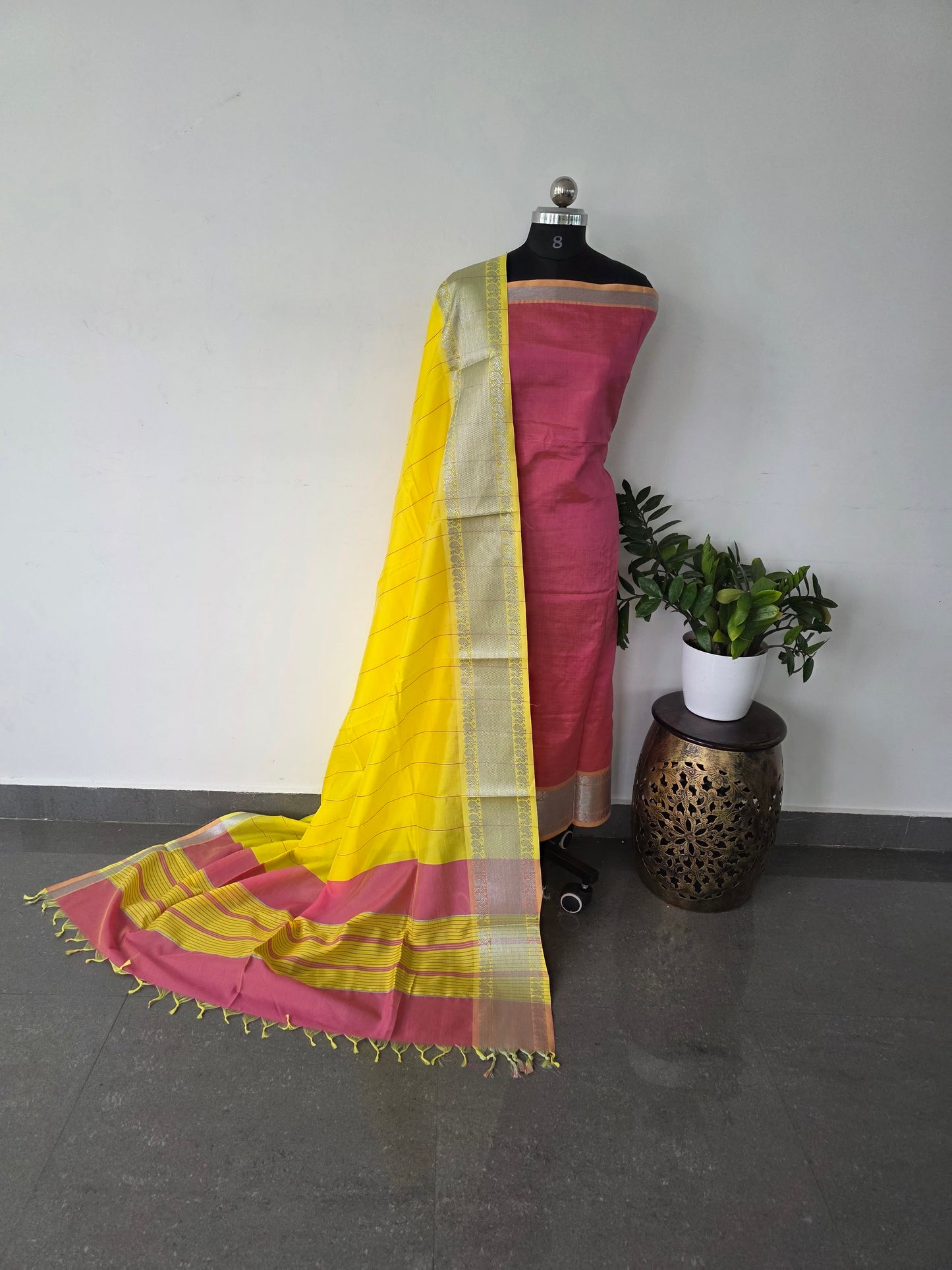 This premium Mangalagiri top features a temple zari border and measures 2.5 meters. The dupatta, also made includes a temple zari border with tassels and is 2.5 meters long.