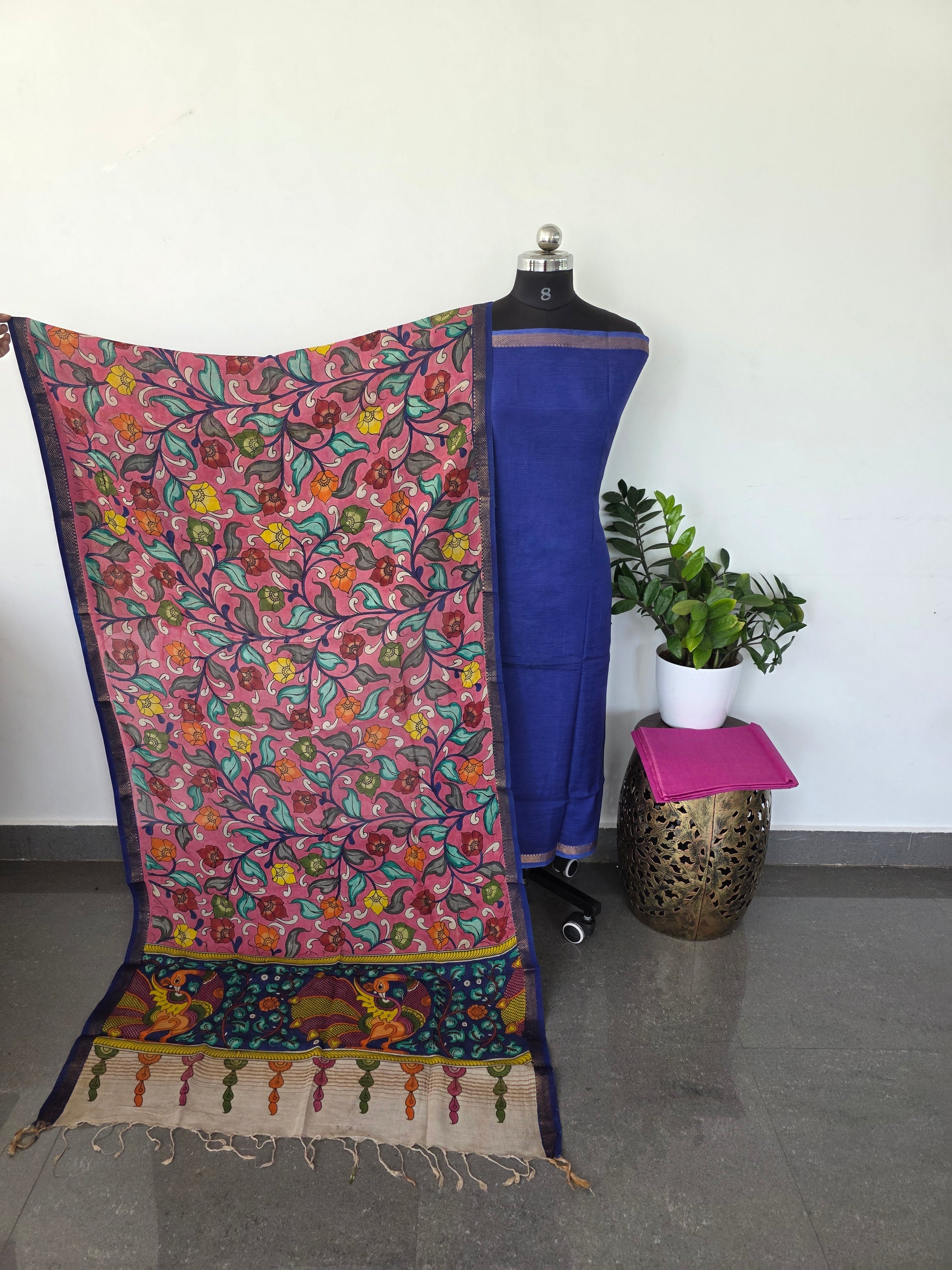 Premium pure Mangalagiri silk top paired with an authentic pure Pen Kalamkari silk dupatta featuring a Nizam border and tasseled edges. The ensemble is completed with a heavy cotton bottom for comfort and durability.