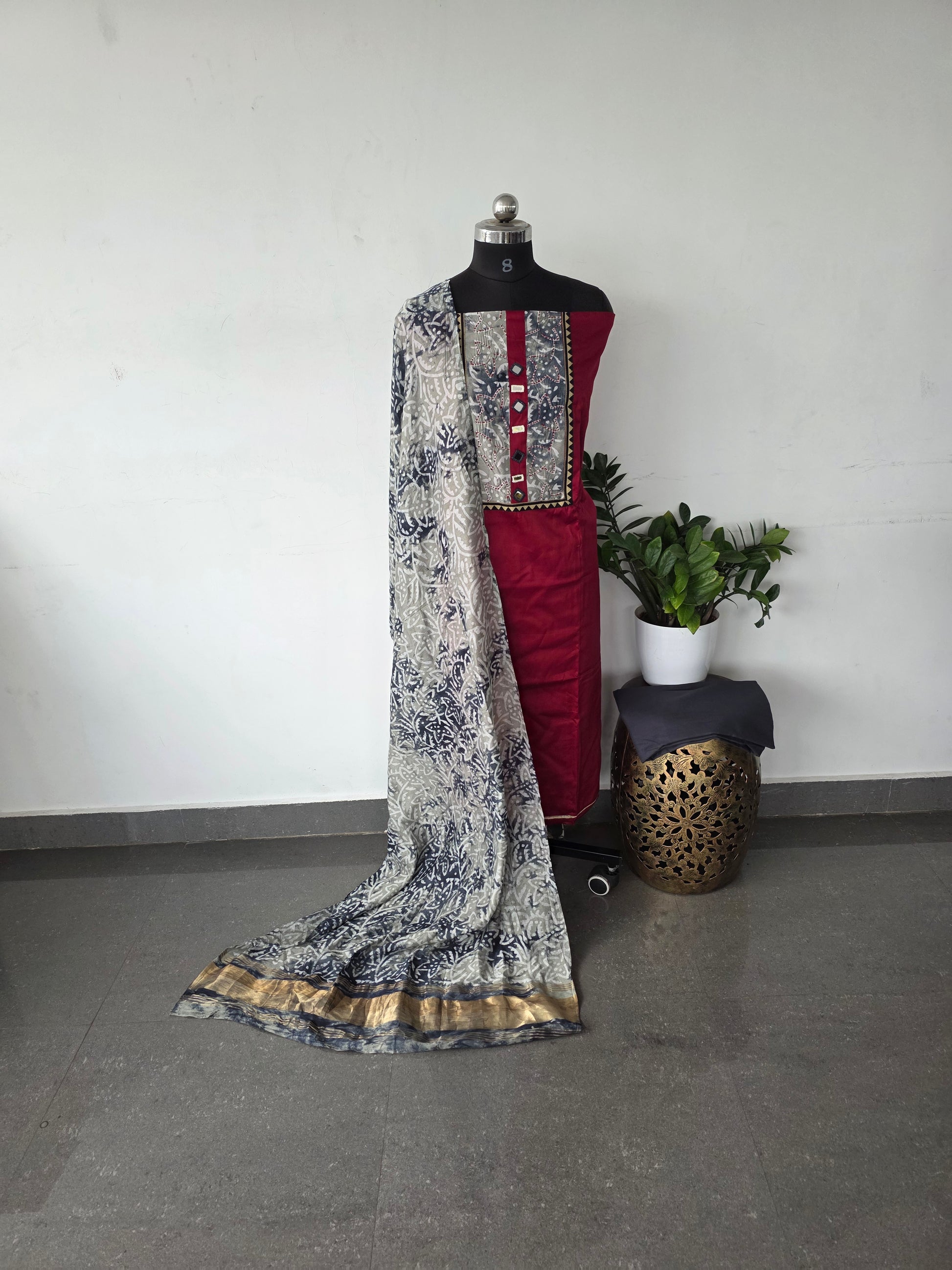 This premium set features a satin cotton top adorned with intricate kantha embroidery and mirror work on the yoke. The bottom includes a soft satin dupatta, complemented by a pure tie-and-dye batik silk shawl enhanced with delicate gotta patti detailing.