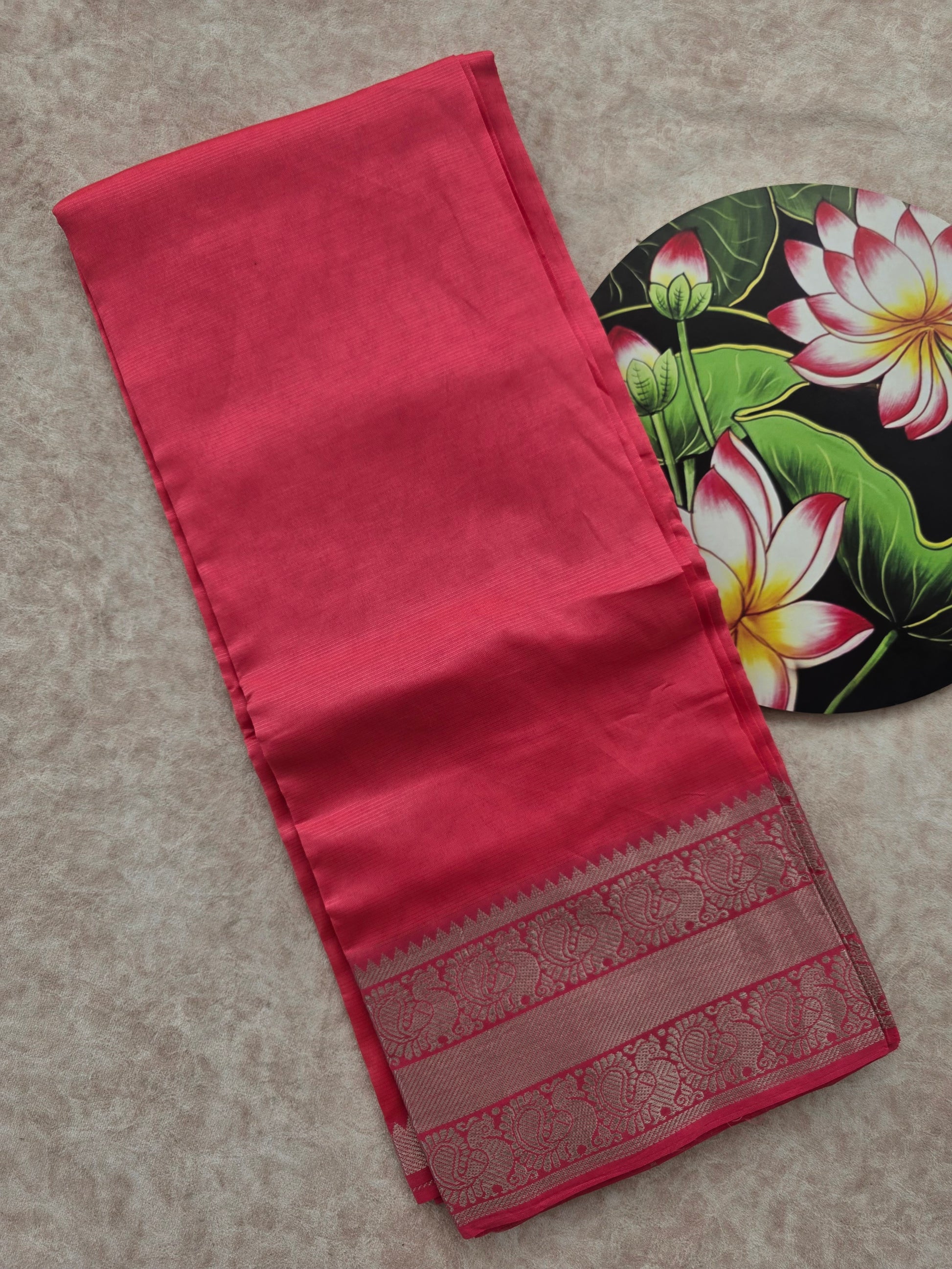 Semi-mangalagiri Pattu sarees combine lightweight cotton with silk to create a soft, long-lasting fabric that shines with a lustrous finish. They typically showcase traditional Kaci or temple borders, often accompanied by understated checks, buttas, or plain designs, paired with contrasting pallus and unstitched blouse pieces.