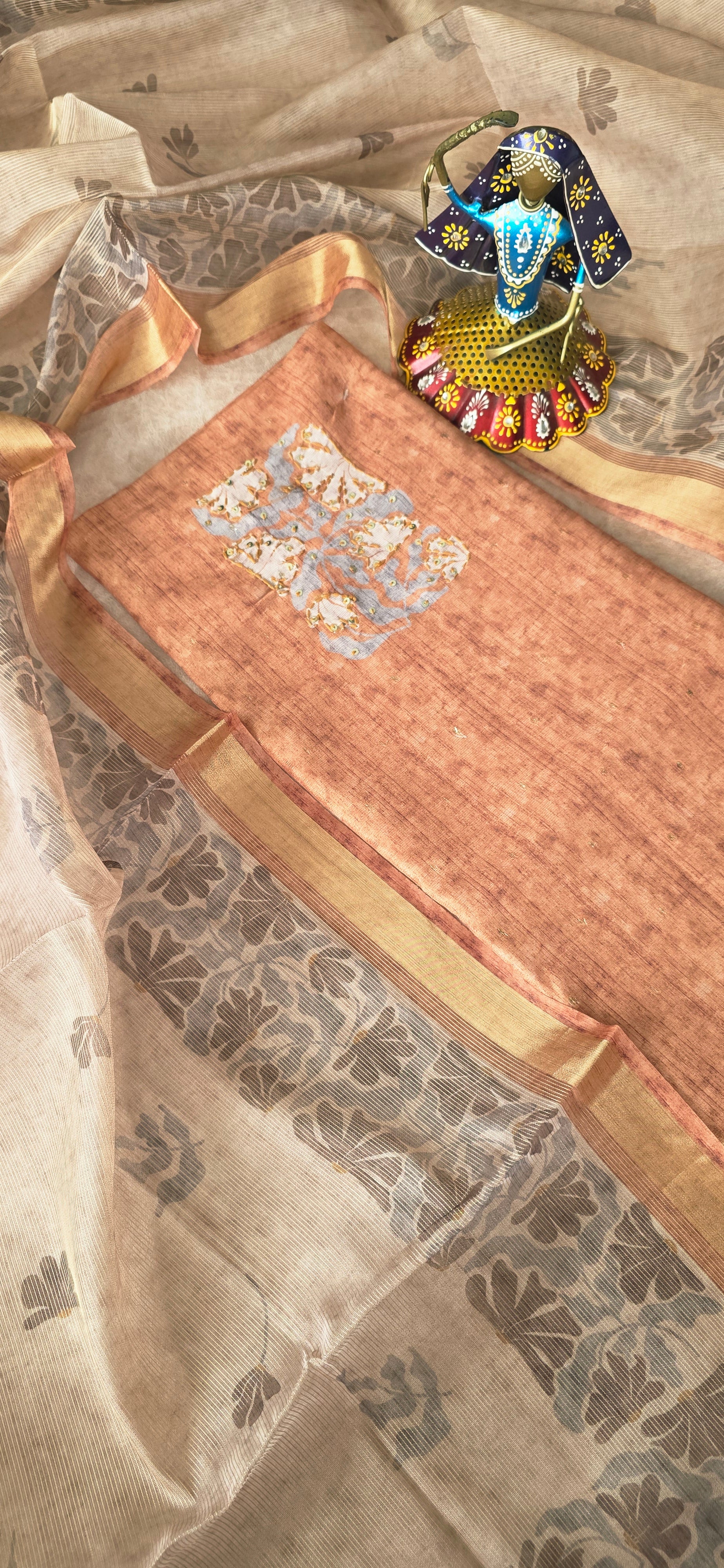 Premium shimmer top adorned with intricate zari buttas and detailed with sequin yoke embellishments. The outfit includes a comfortable cotton bottom and is complemented by a shimmer organza silk shawl featuring a vibrant digital print.
