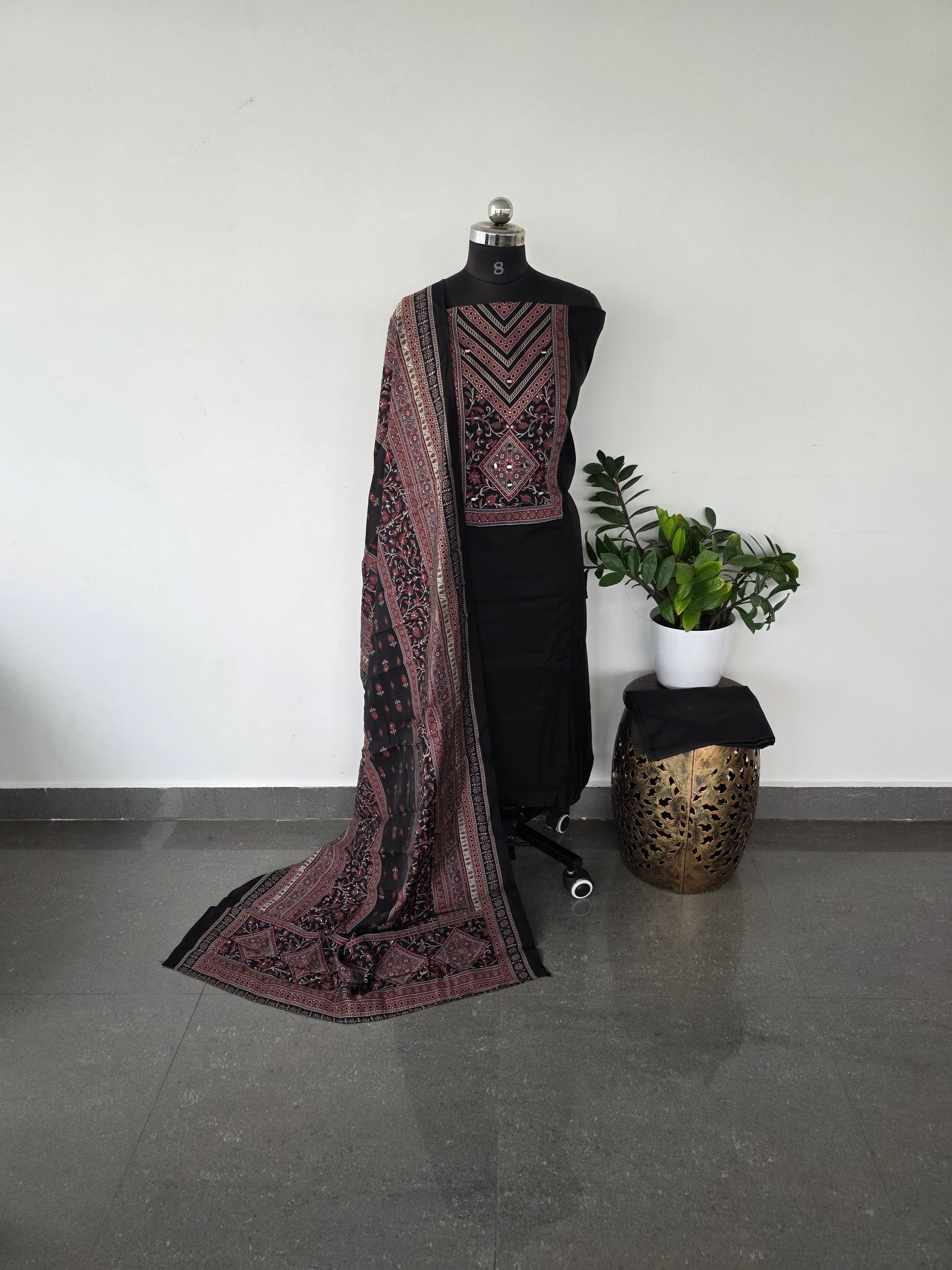 Premium soft silk top featuring an ajrakh mirror yoke patch, paired with a silk dupatta and a soft ajrakh silk shawl.