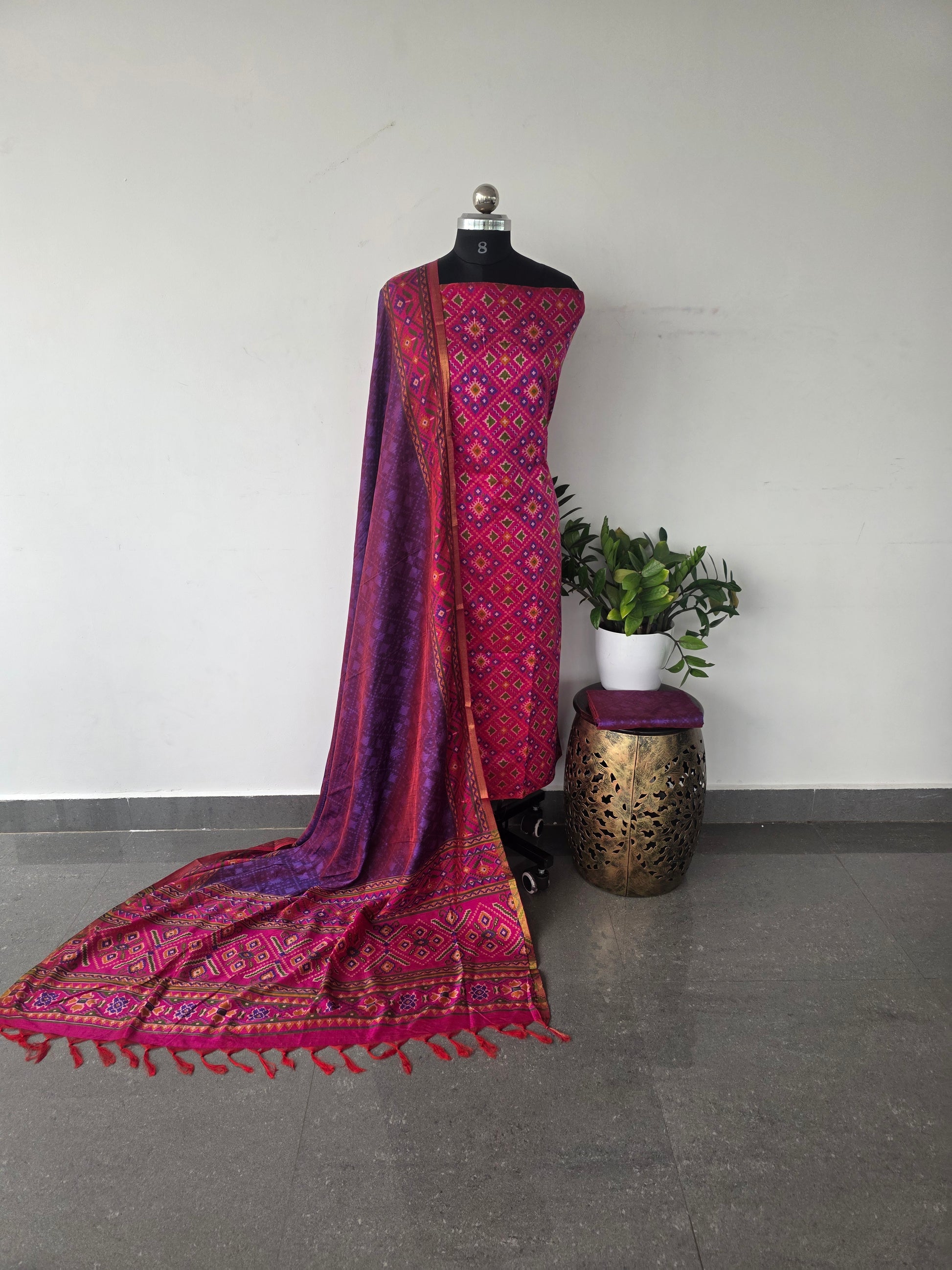 Premium dual-shade Patola silk top and bottom paired with a soft Patola silk dupatta featuring and delicate tassels.