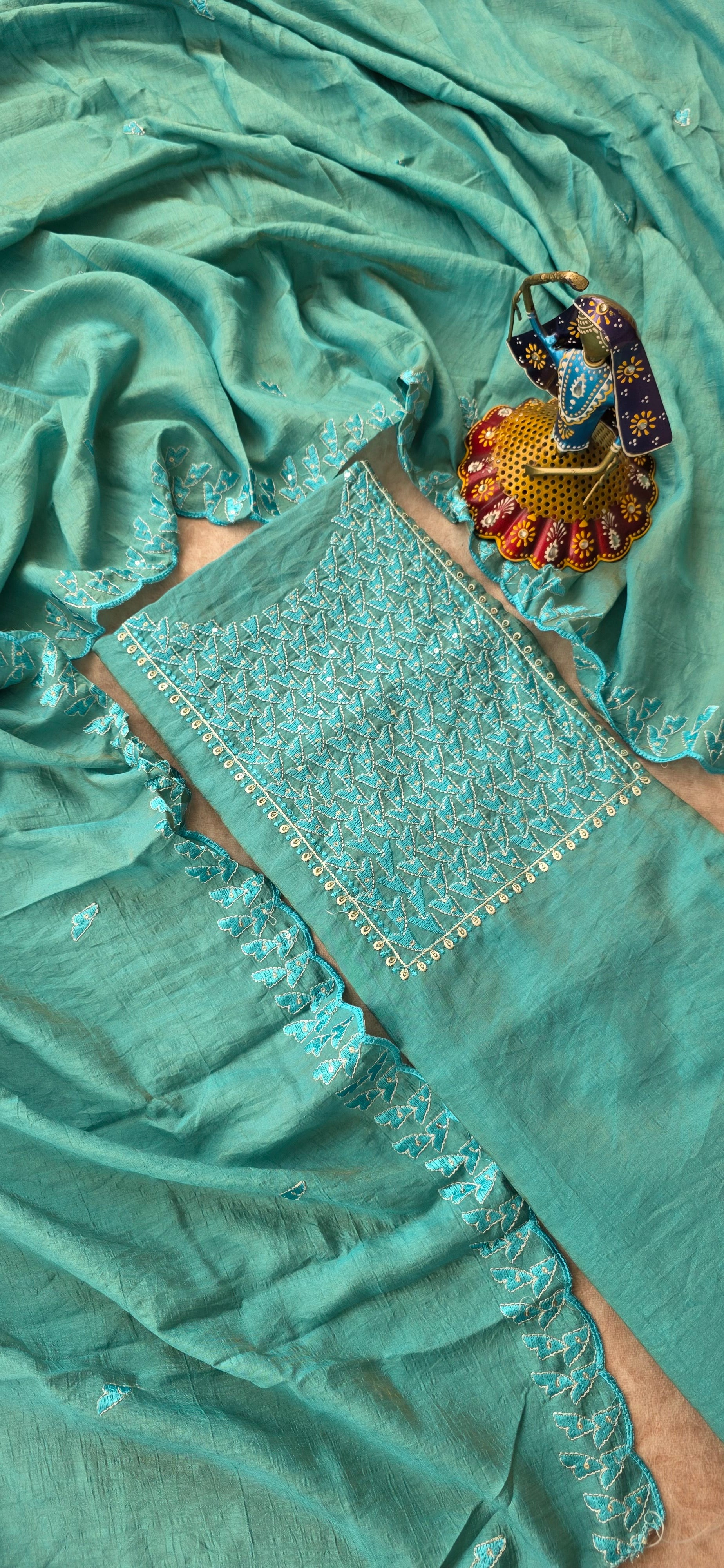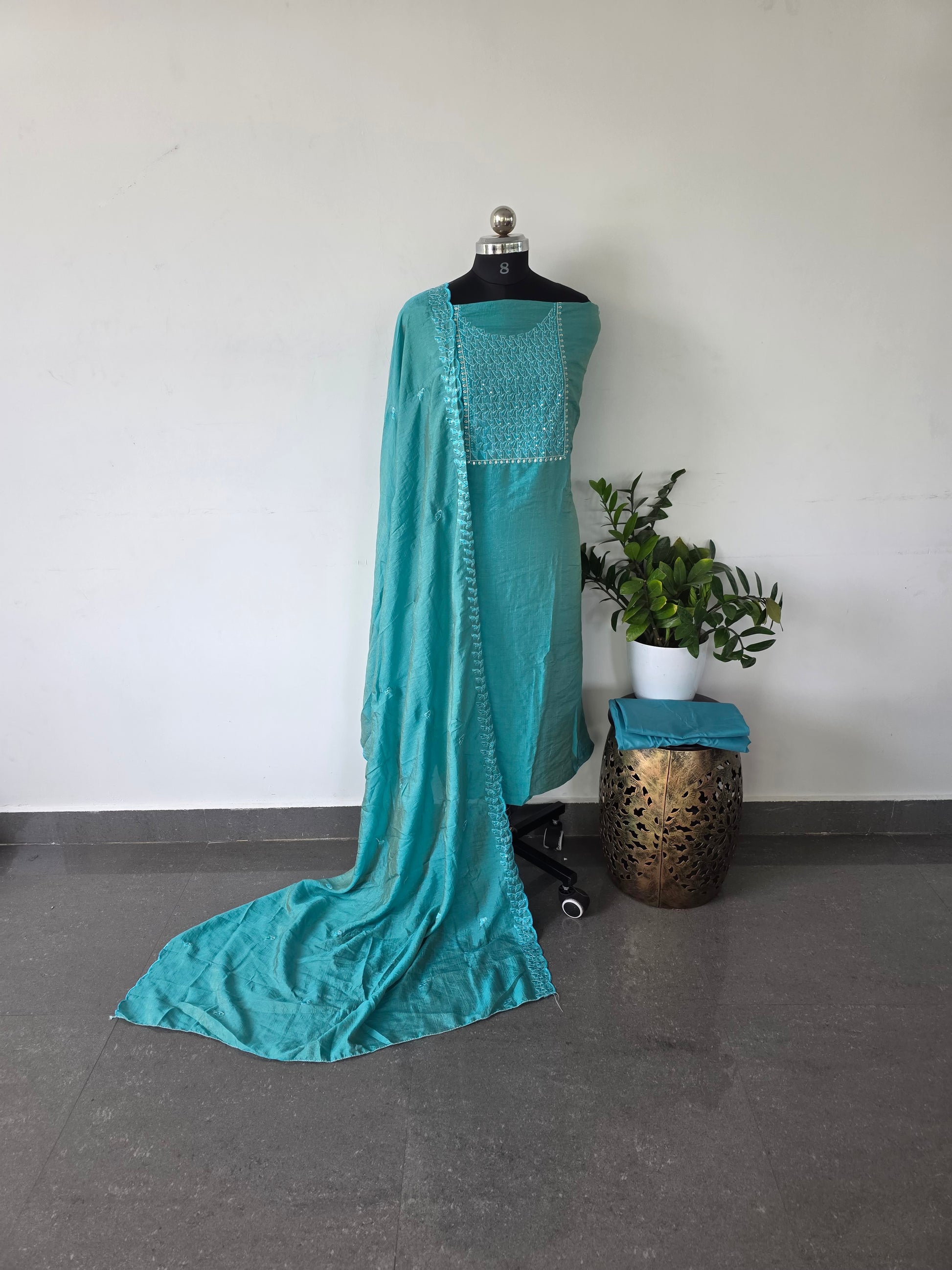 Premium soft silk top featuring intricate sequin embroidery and lined for comfort. The bottom is paired with a matching silk dupatta crafted from premium soft silk, adorned with detailed embroidery and finished with elegant tassels.