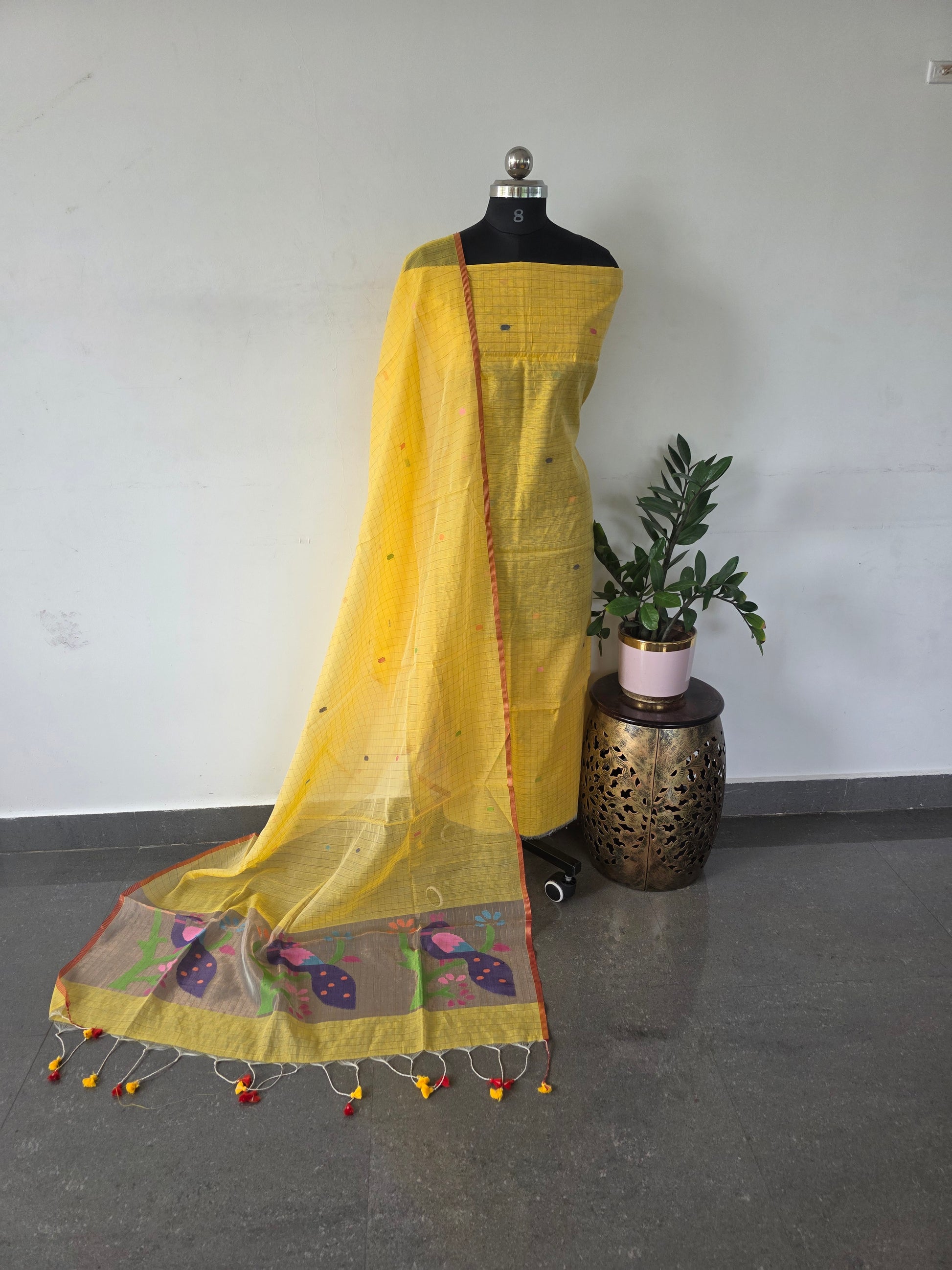 Premium zari checked muslin jamdhani top, premium zari checked muslin jamdhani duppatta with tissue paithani pallu and tassels