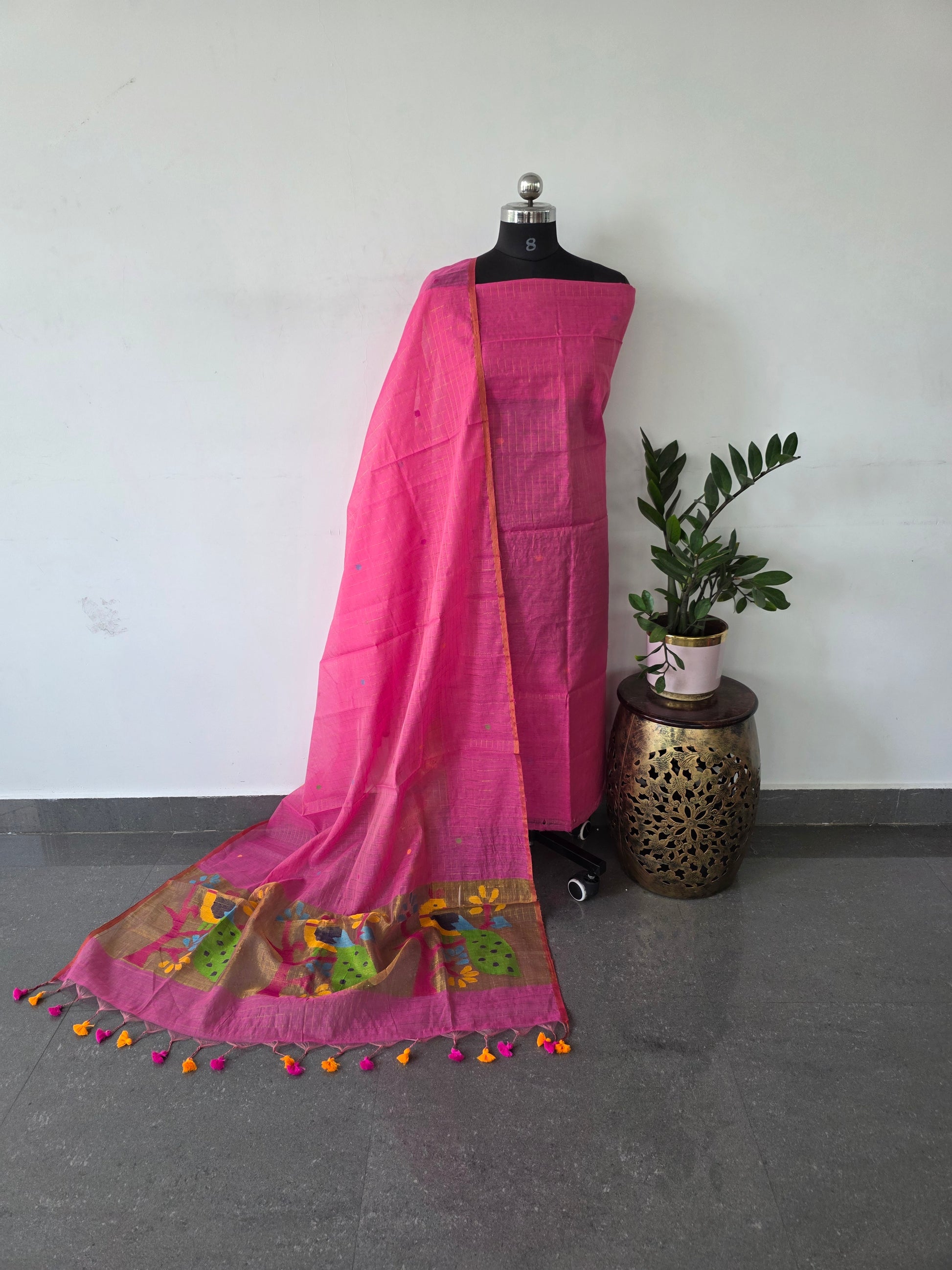 Premium zari checked muslin jamdhani top, premium zari checked muslin jamdhani duppatta with tissue paithani pallu and tassels