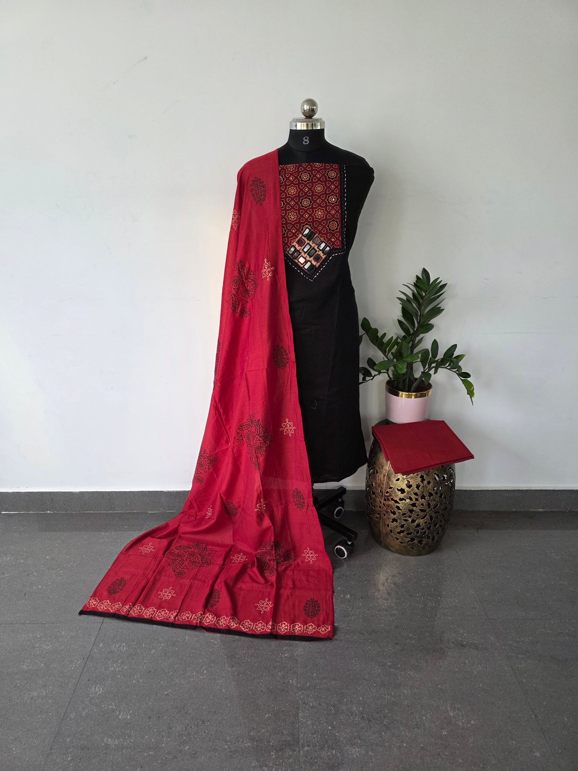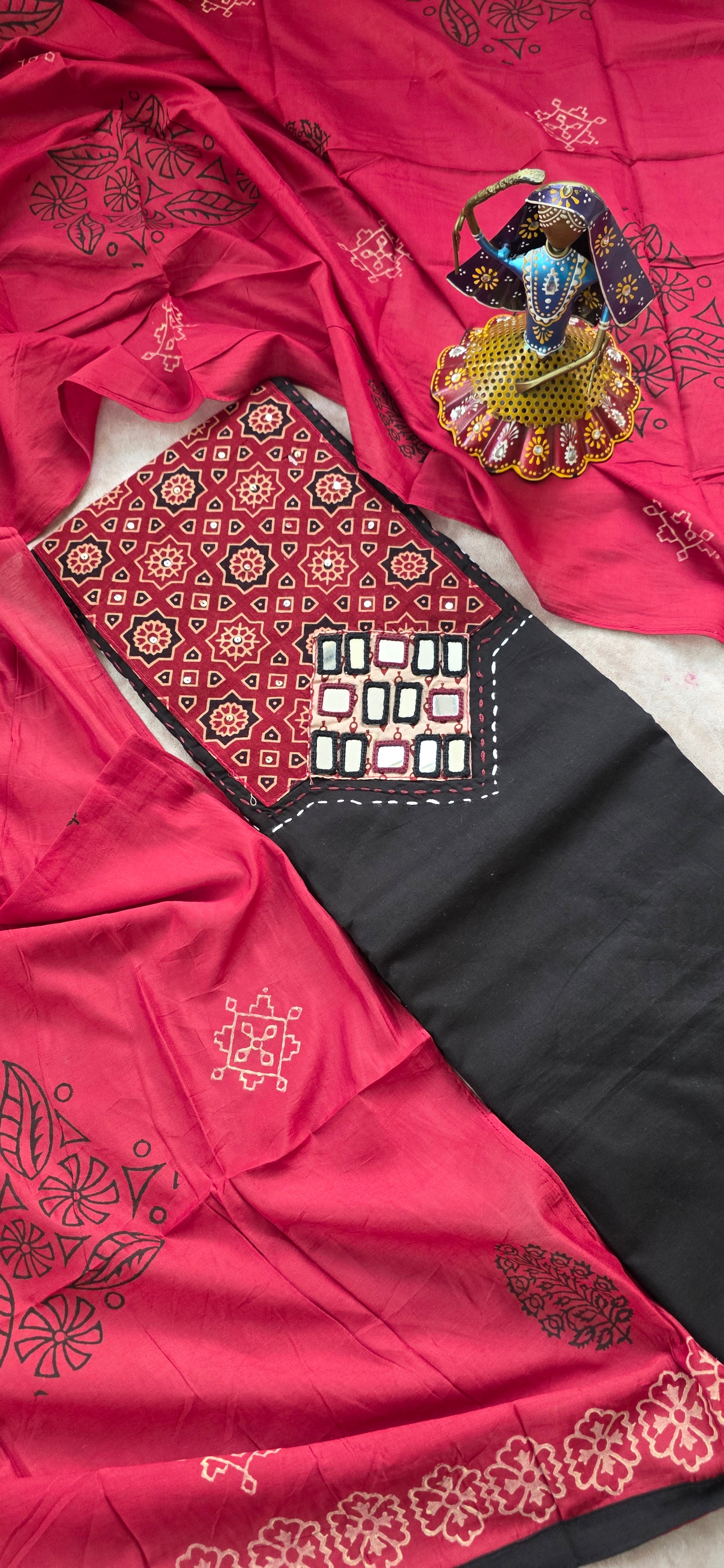 Pure cotton top with ajrakh patch with real mirror , cotton bottom, soft silk shawl with block prints