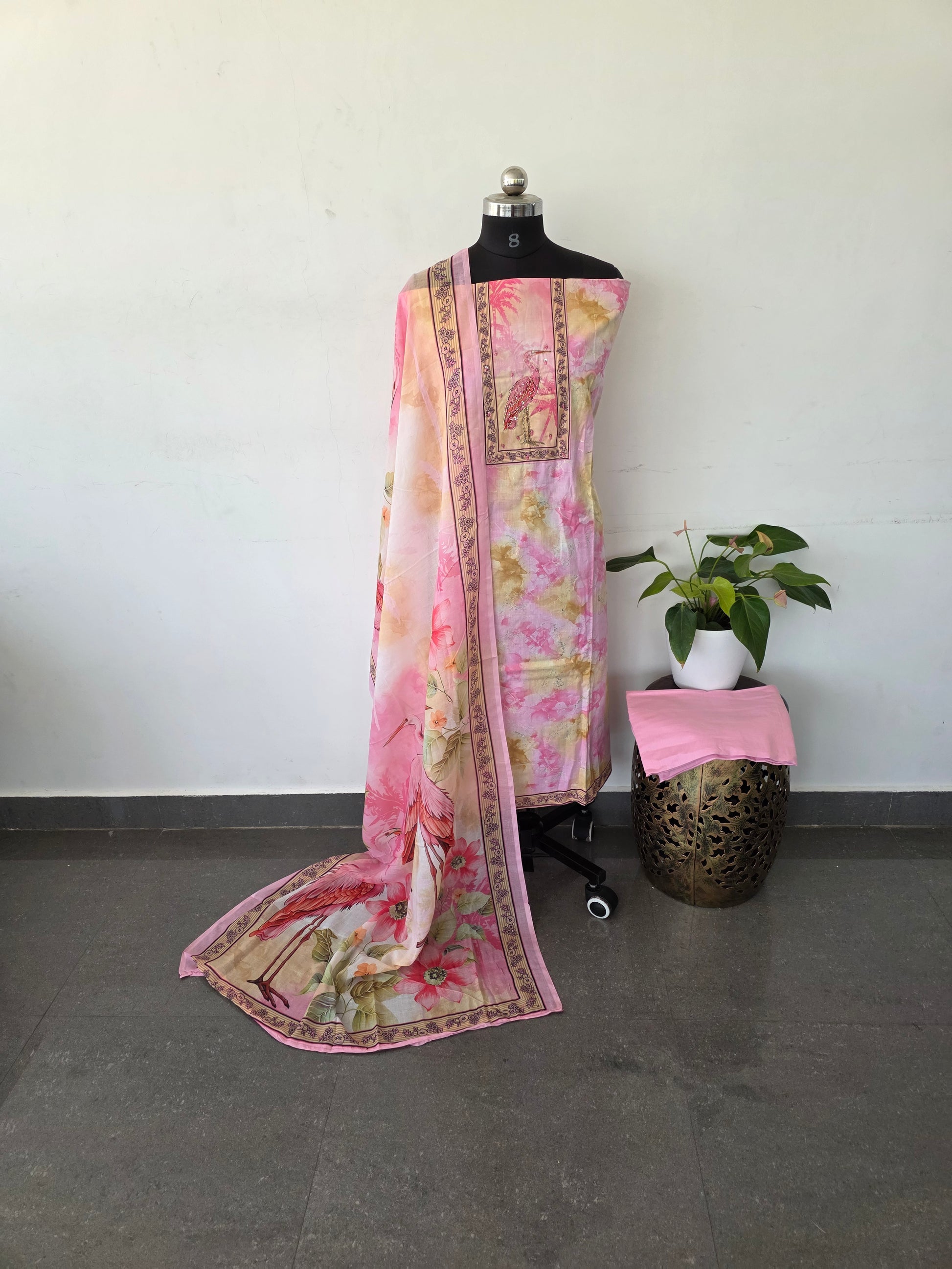 This ensemble features a top crafted from pure cotton, adorned with an embroidered sequin yoke patch. The bottom is made of pure cotton, complemented by a soft digital silk shawl as the dupatta.