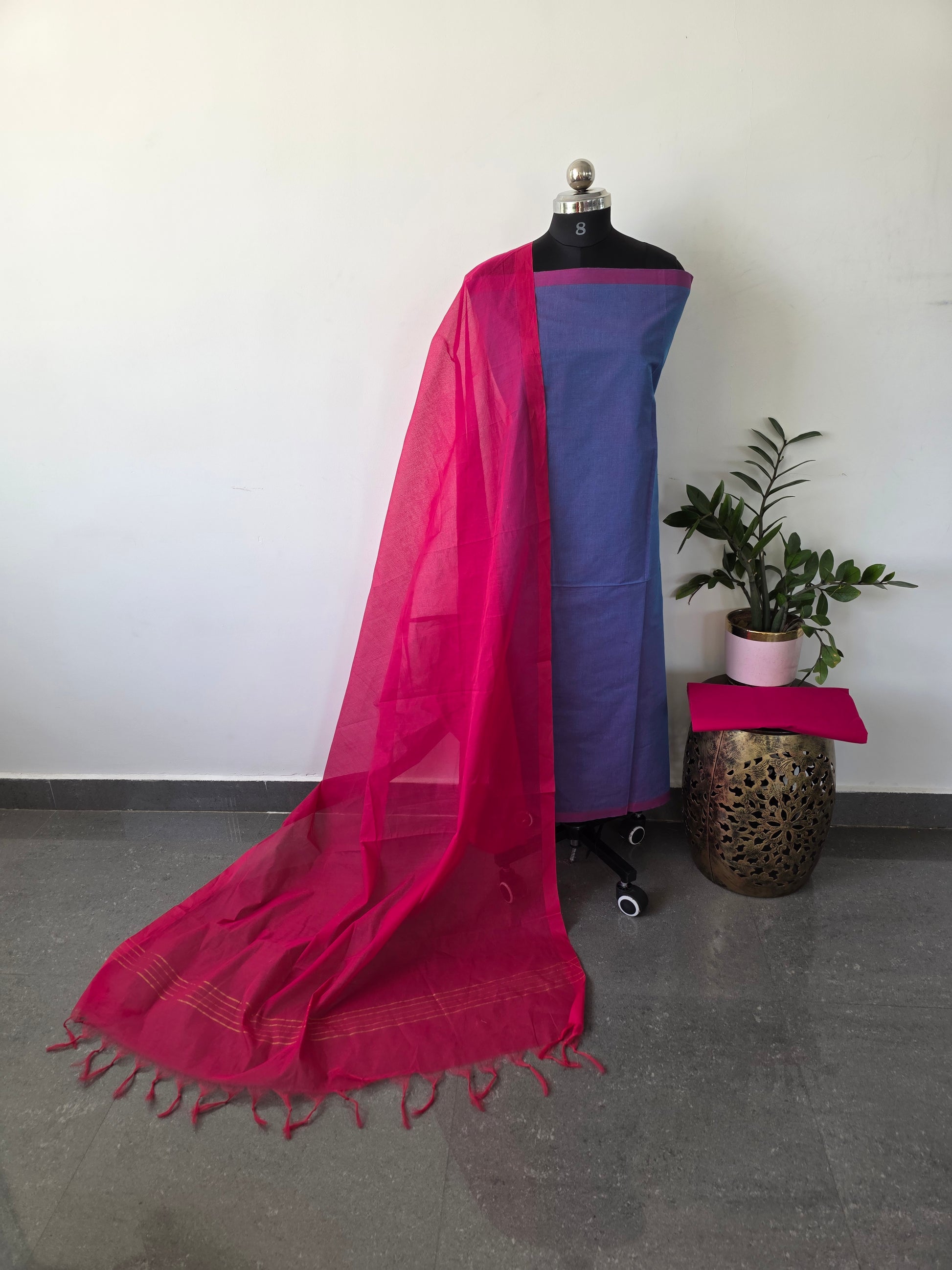 This set features a top crafted from pure cotton with subtle stripes and a plain border, paired with a cotton bottom. The ensemble is completed by a pure cotton shawl adorned with tassels, offering both comfort and elegance.