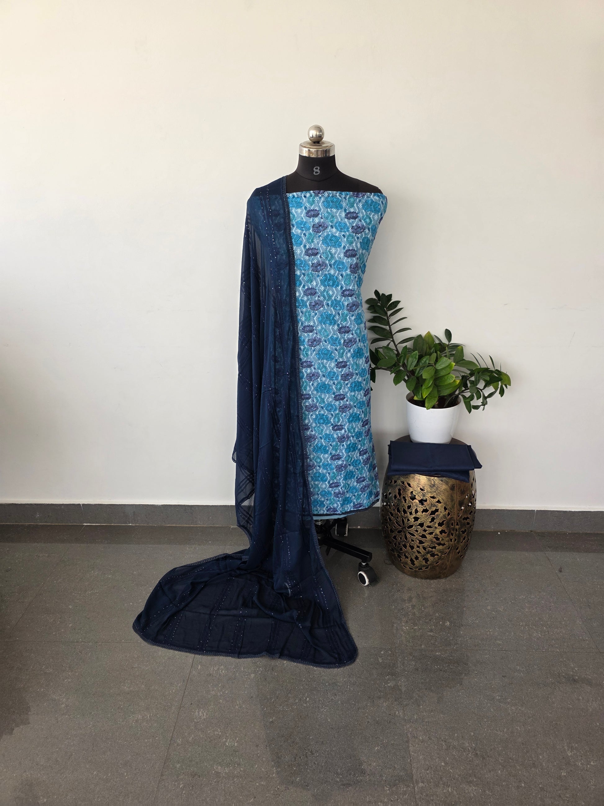 Top consists of pure georgette fabric with lining and detailed all-over sequin embroidery. The bottom is crafted from satin, complemented by a pure floral georgette dupatta featuring sequined embroidery along both edges.