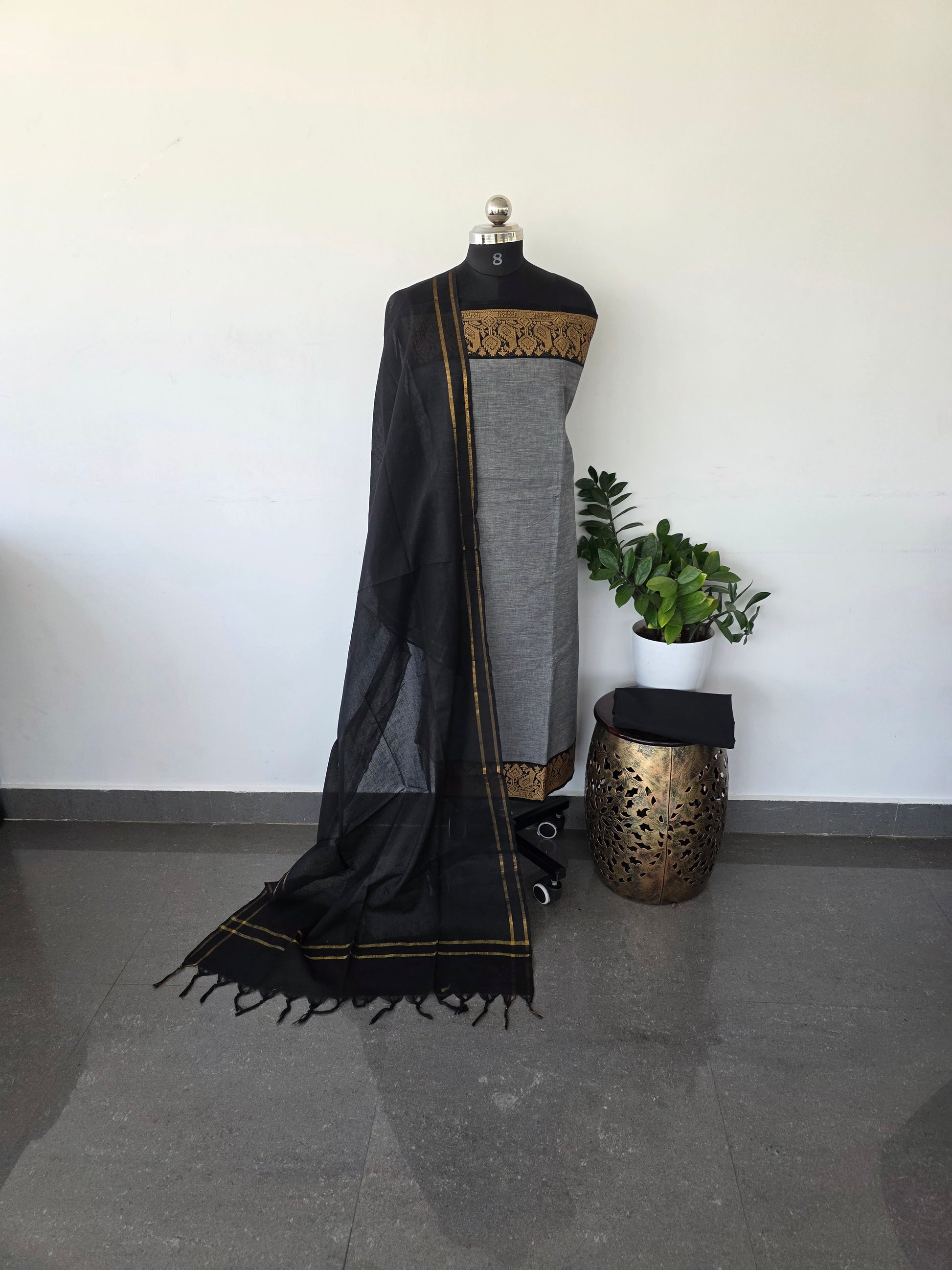 This set features a pure cotton top adorned with a kanchi border, paired with a cotton bottom. The ensemble is completed by a pure cotton shawl embellished with a zari border and finished with tassels.