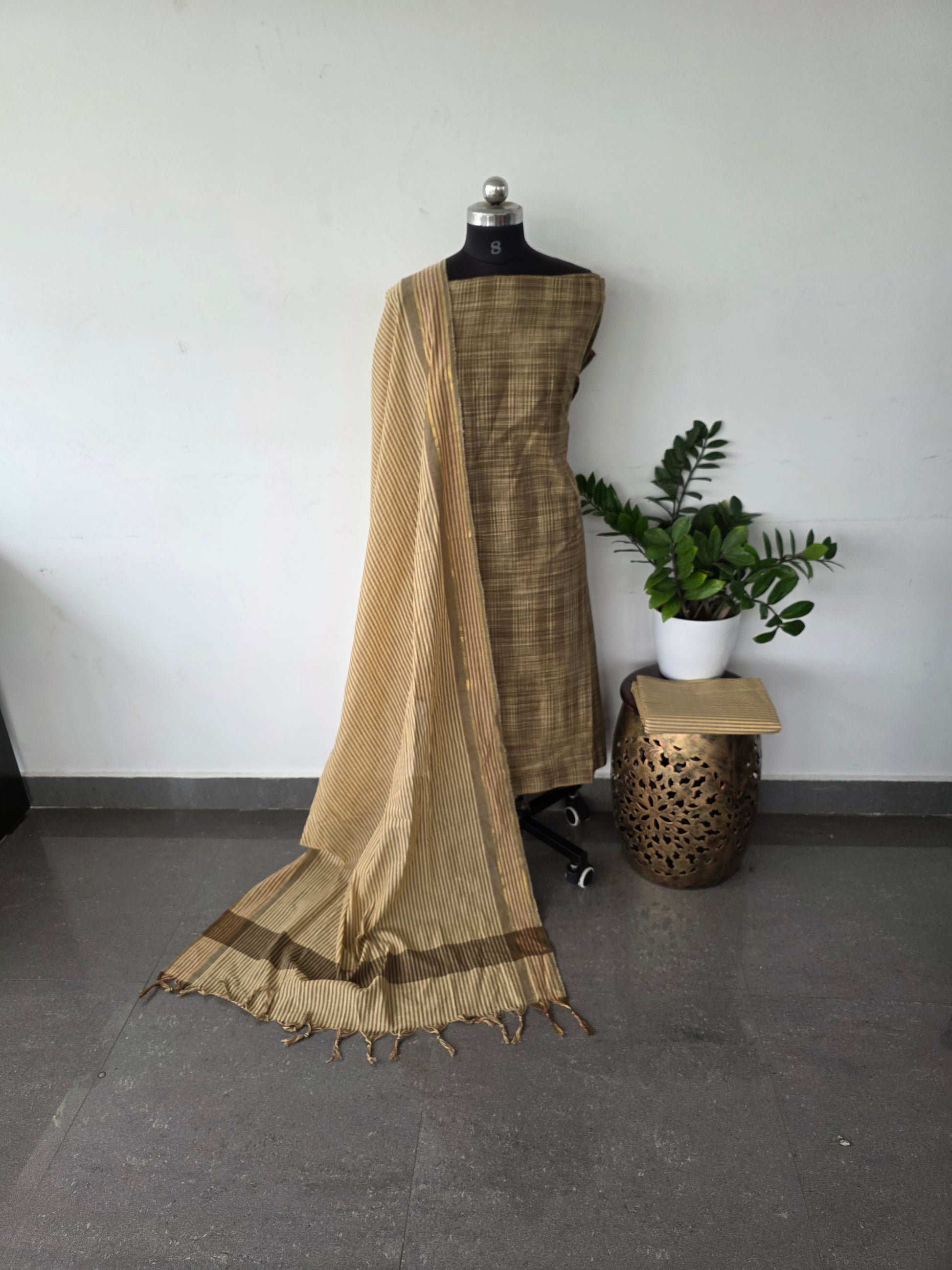 This elegant set features a pure handloom cotton top (2.5 meters), paired with a cotton bottom adorned with subtle stripes. The cotton dupatta (2.25 meters) complements the ensemble with mild stripes, a zari border, and delicate tassels. Designed for comfort and affordability, this set is ideal for formal occasions and office wear. Don’t miss the chance to own this exquisite pure cotton collection.
