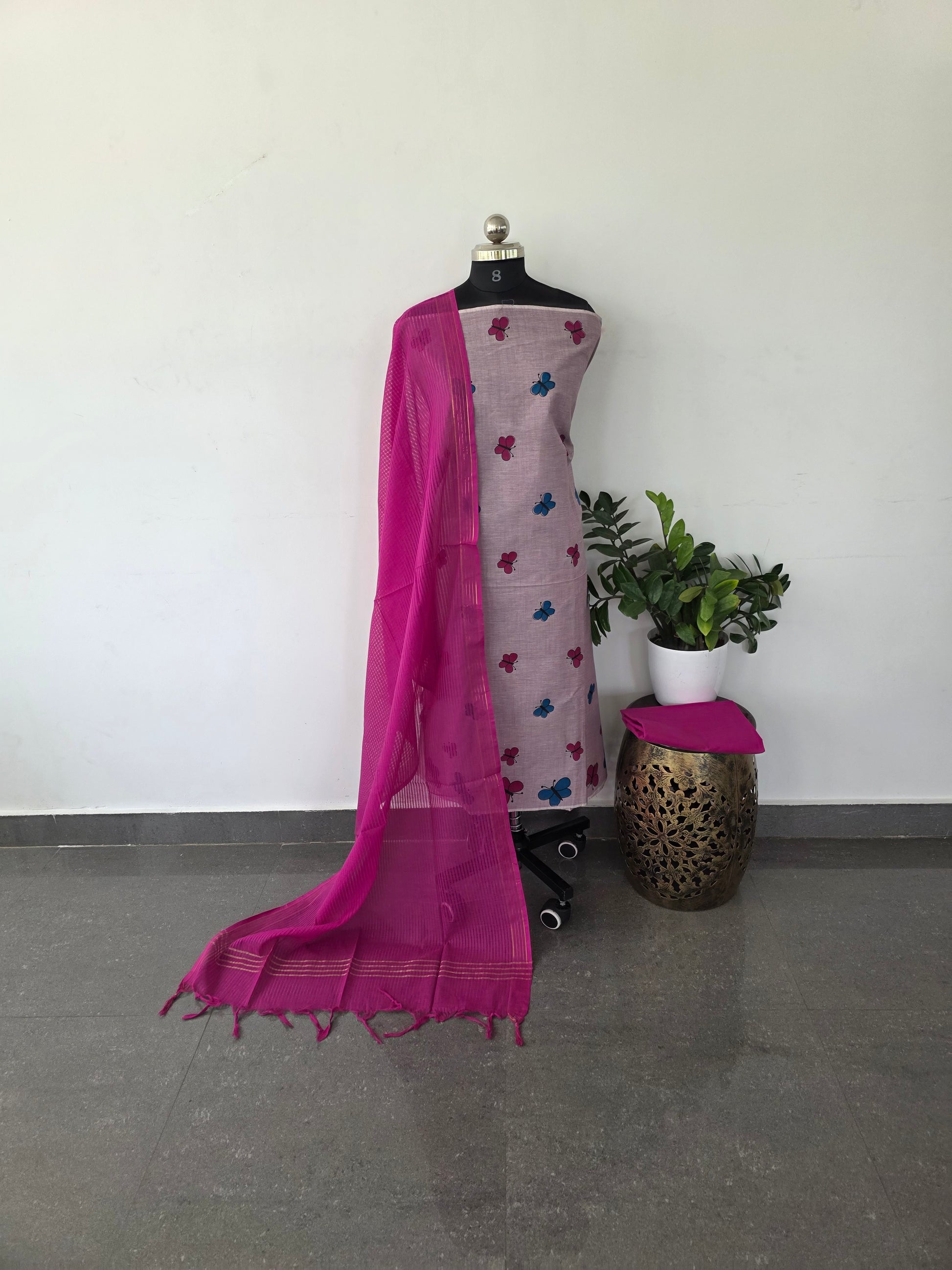 This set features a pure handloom cotton top adorned with traditional Warli prints, paired with a cotton bottom. The ensemble is completed by a pure cotton dupatta, enhanced with an elegant zari border and delicate tassels.
