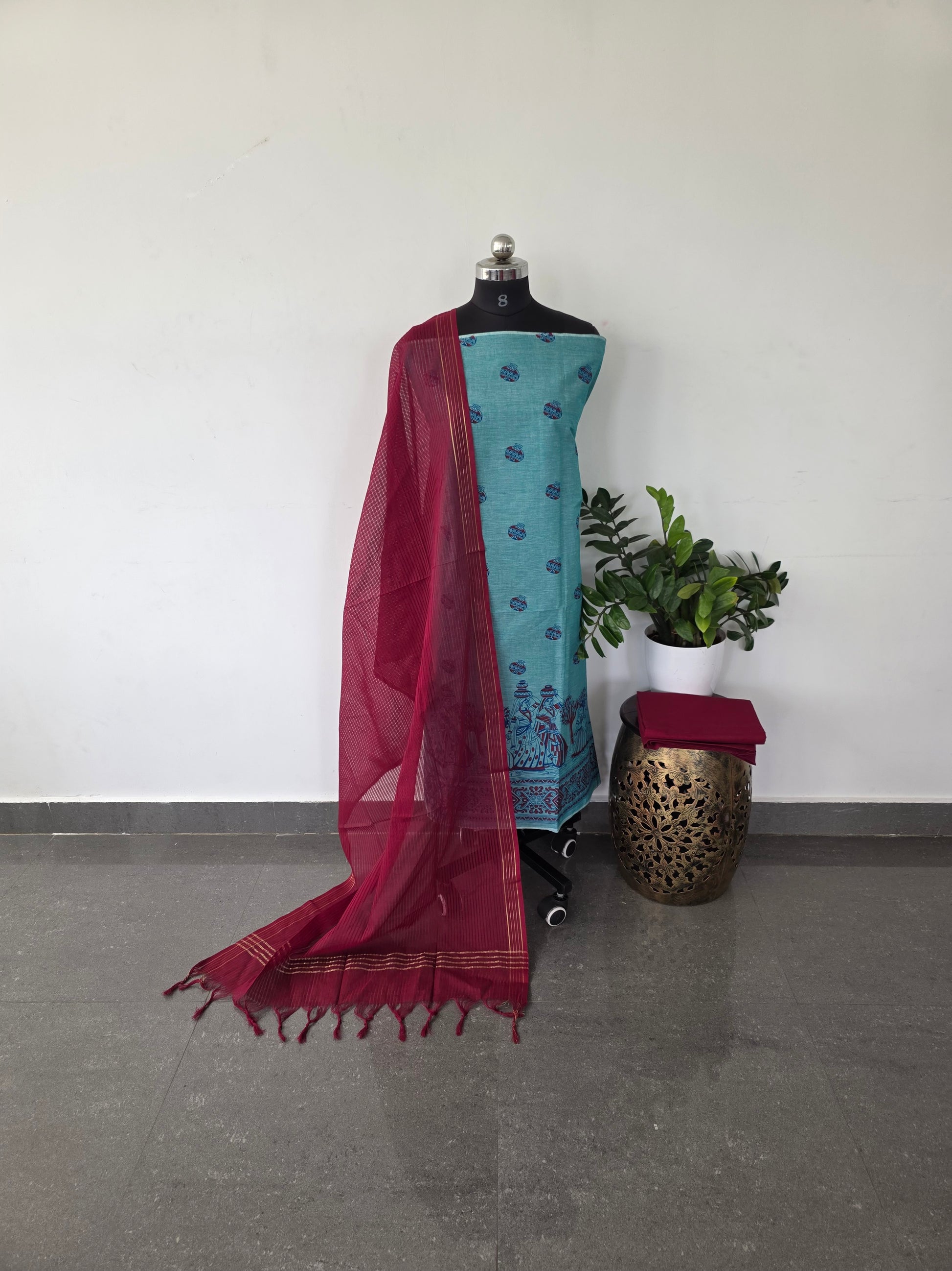 This set features a pure handloom cotton top adorned with traditional Warli prints, paired with a cotton bottom. The ensemble is completed by a pure cotton dupatta, enhanced with an elegant zari border and delicate tassels.