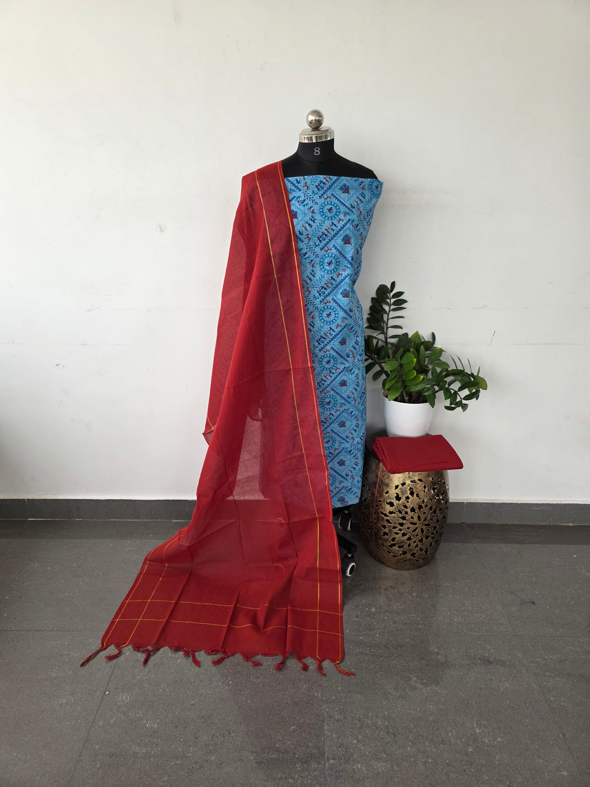 This set features a pure handloom cotton top adorned with traditional Warli prints, paired with a cotton bottom. The ensemble is completed by a pure cotton dupatta, enhanced with an elegant zari border and delicate tassels.