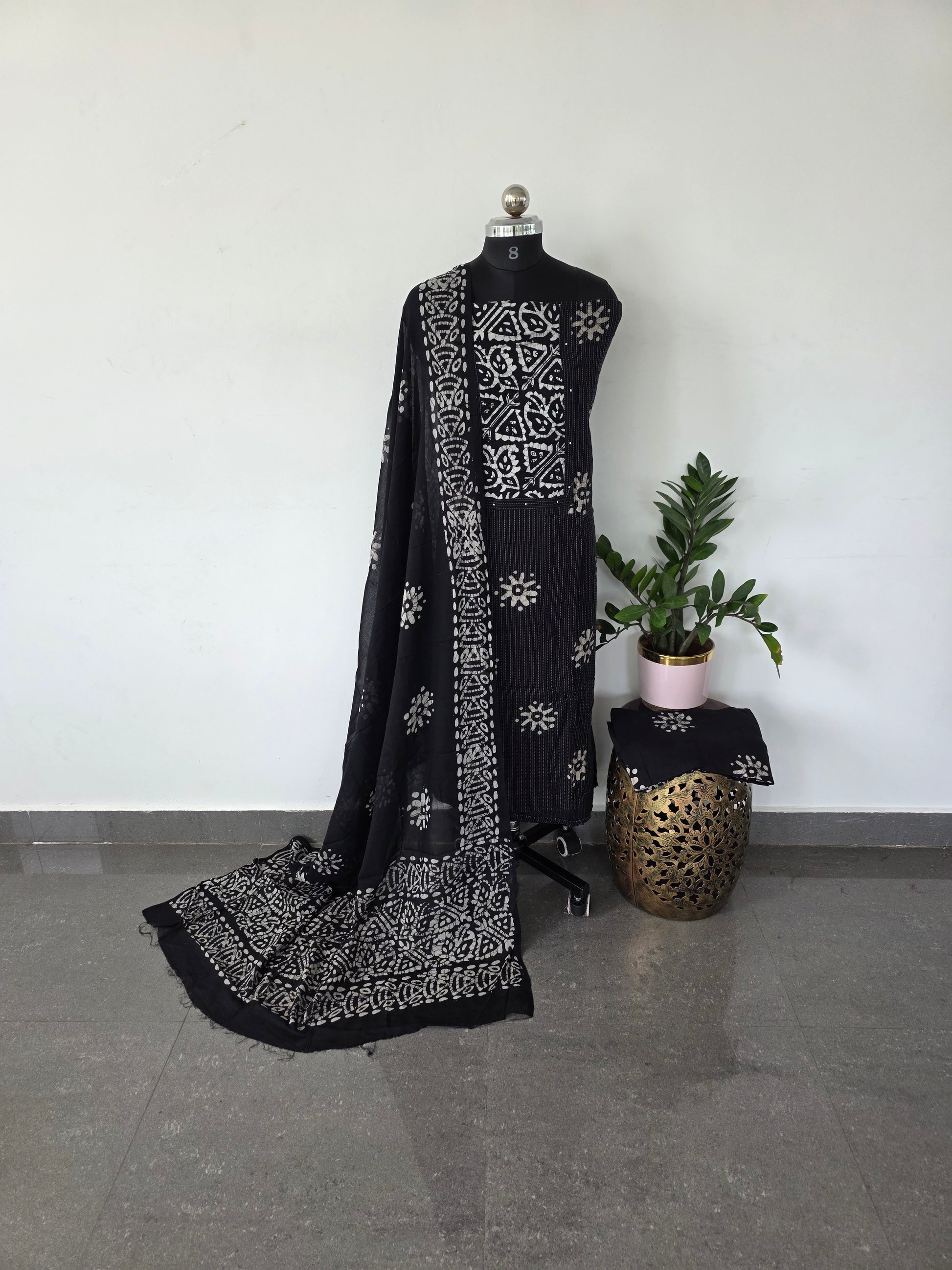 Pure kantha batik cotton top with embroidery sequence yoke , batik cotton bottom, pure batik cotton shawl