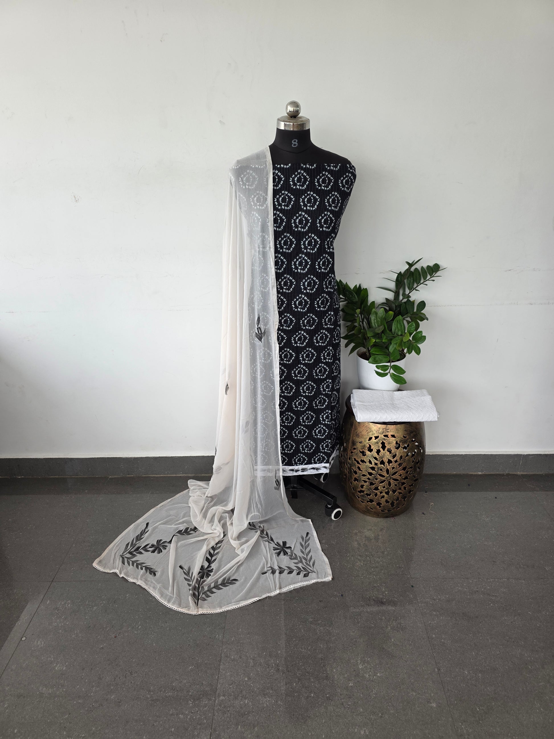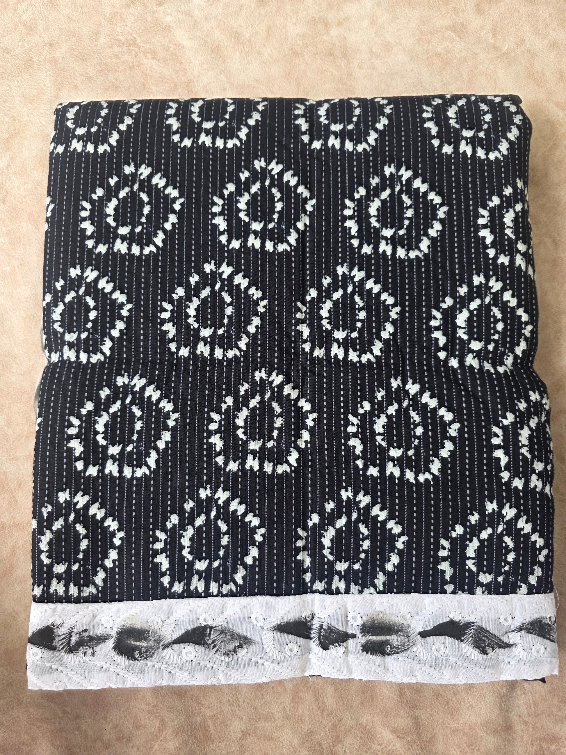 This ensemble features a top crafted from pure Kantha Jaipuri cotton, paired with a Chikankari cotton bottom. The look is completed with a painted chiffon shawl that boasts an elegant lace border, blending traditional craftsmanship with refined style.