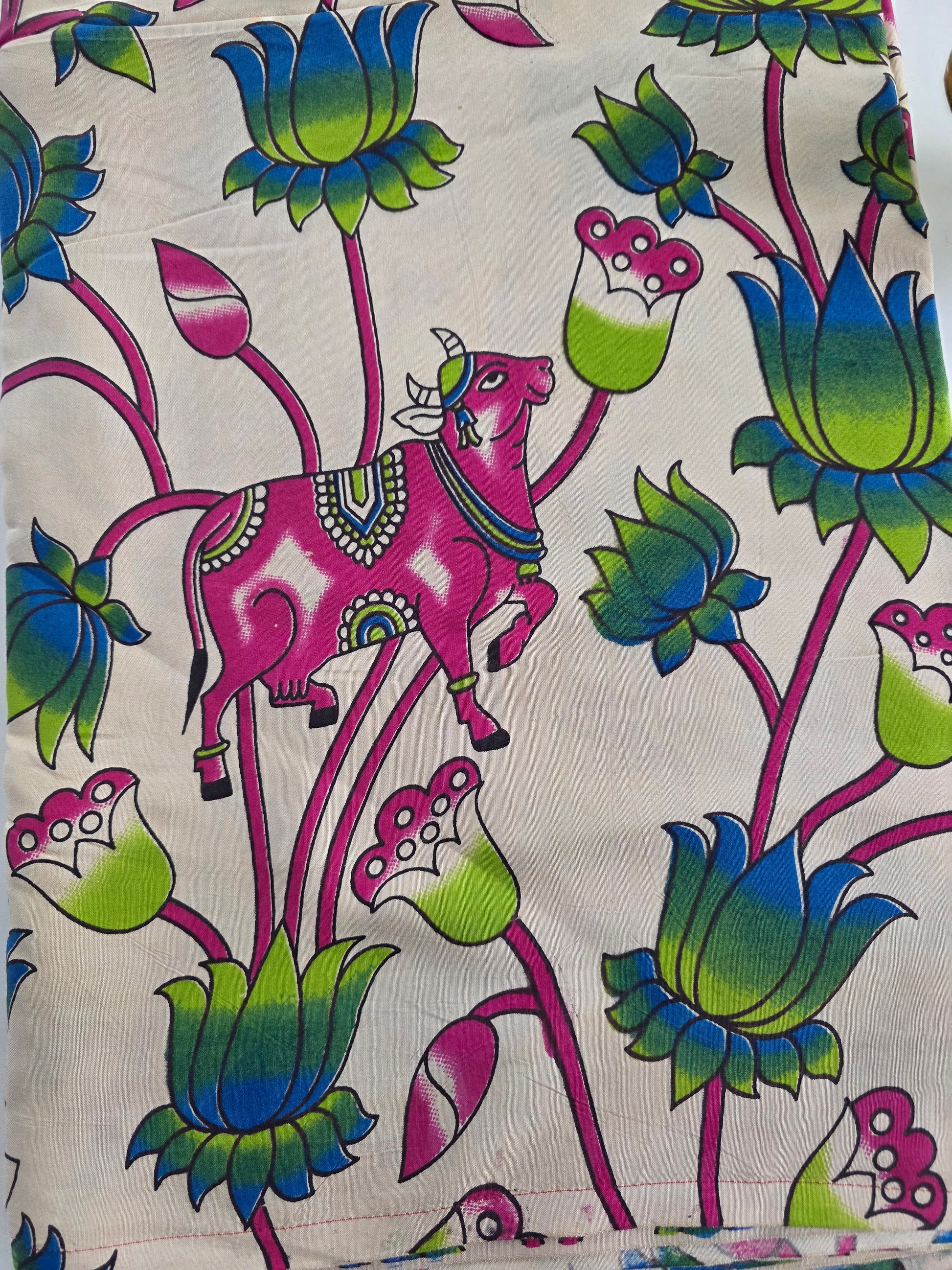 pure silk kalamkari running material crafted with the timeless art of hand block printing , this pure silk kalamkari fabric is made from natural cotton , offering a soft , breathable , and comfortable feel and pure cotton