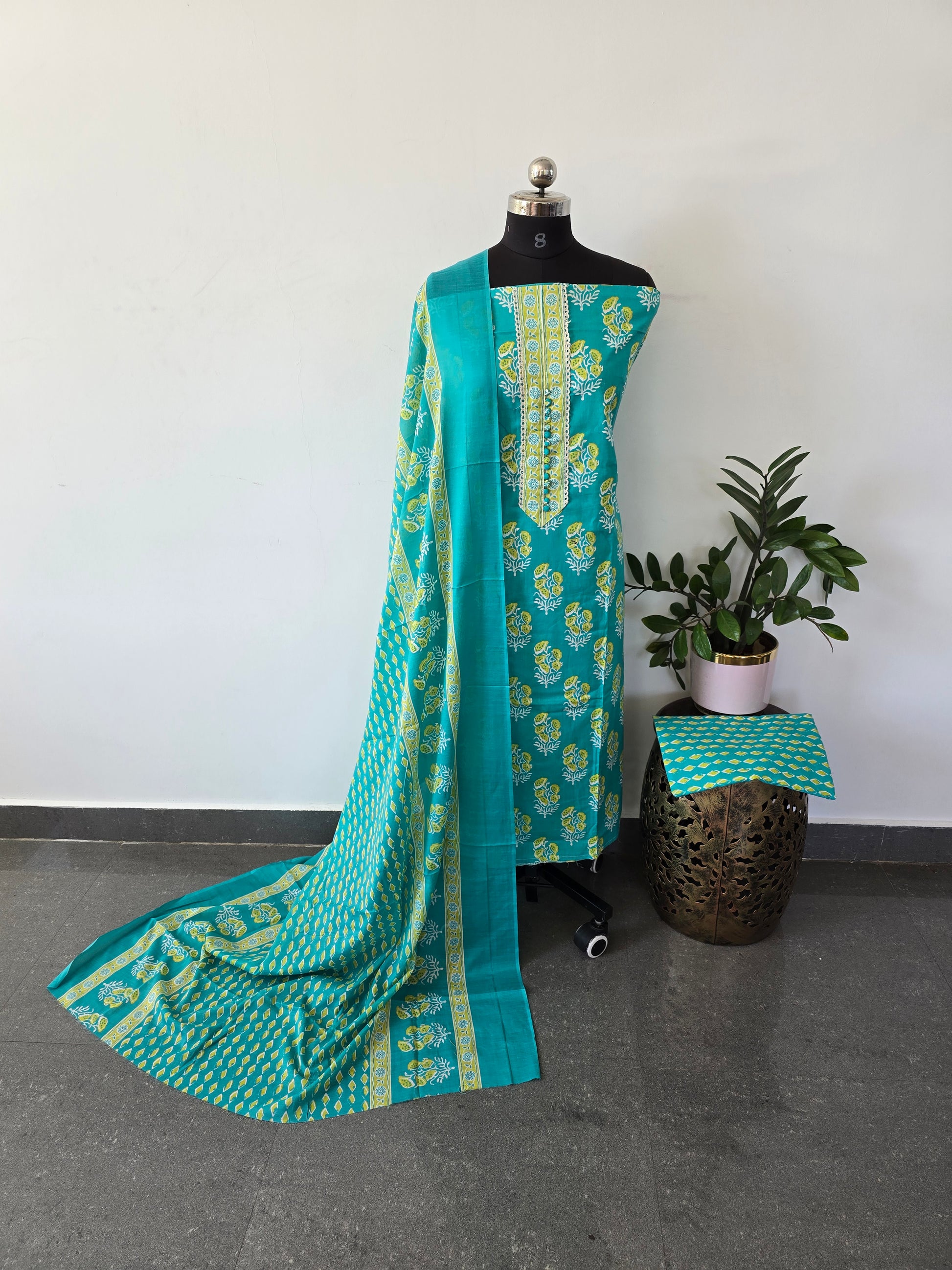 Crafted from pure cotton, this three-piece ensemble features a kalamkari-printed neckline on the top, coordinating printed bottom, and a matching dupatta. Ideal for professional settings and everyday wear, the natural fiber ensures breathability and comfort throughout the day while the traditional print adds understated sophistication to your wardrobe.