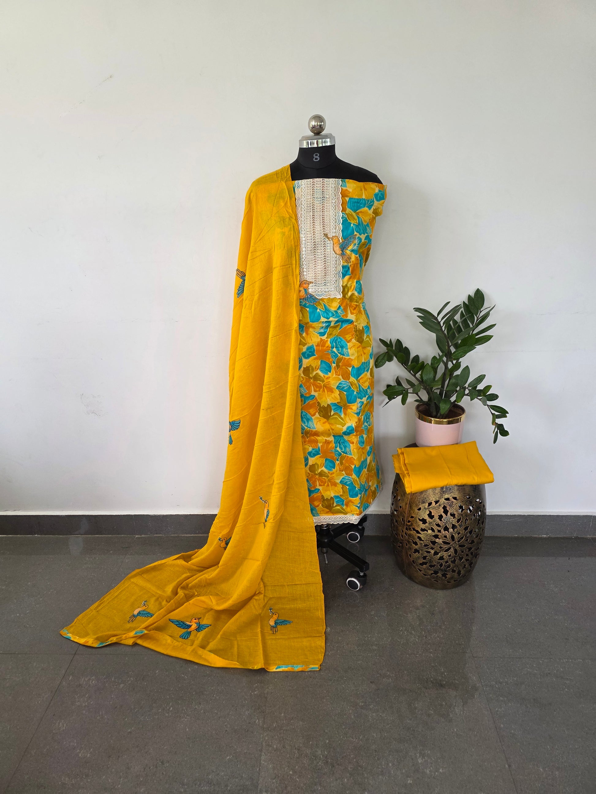 This curated three-piece ensemble combines luxurious satin-cotton construction with hand-executed appliqué embellishment. The tailored top features detailed neckwork in complementary tones, paired with a fluid silk duppatta and a striking appliqué-embellished shawl. Crafted for discerning patrons of authentic ethnic textiles, each component reflects meticulous artisanal technique and premium fabric selection.