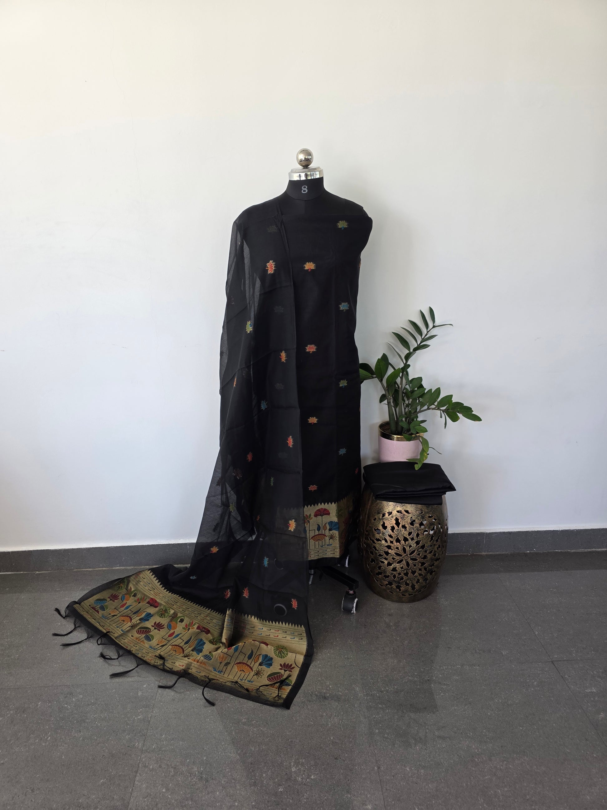 Premium jamdhani paithani silk cotton set (black)- X6