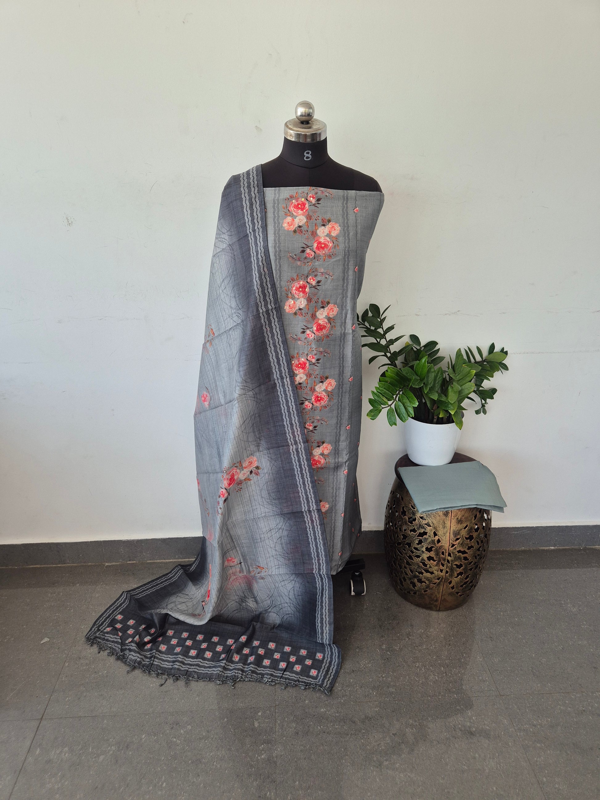 This soft silk set features an elegant top adorned with exquisite neck detailing. The bottom pairs with a soft silk dupatta, enhanced by a refined digital print, completing the sophisticated ensemble.