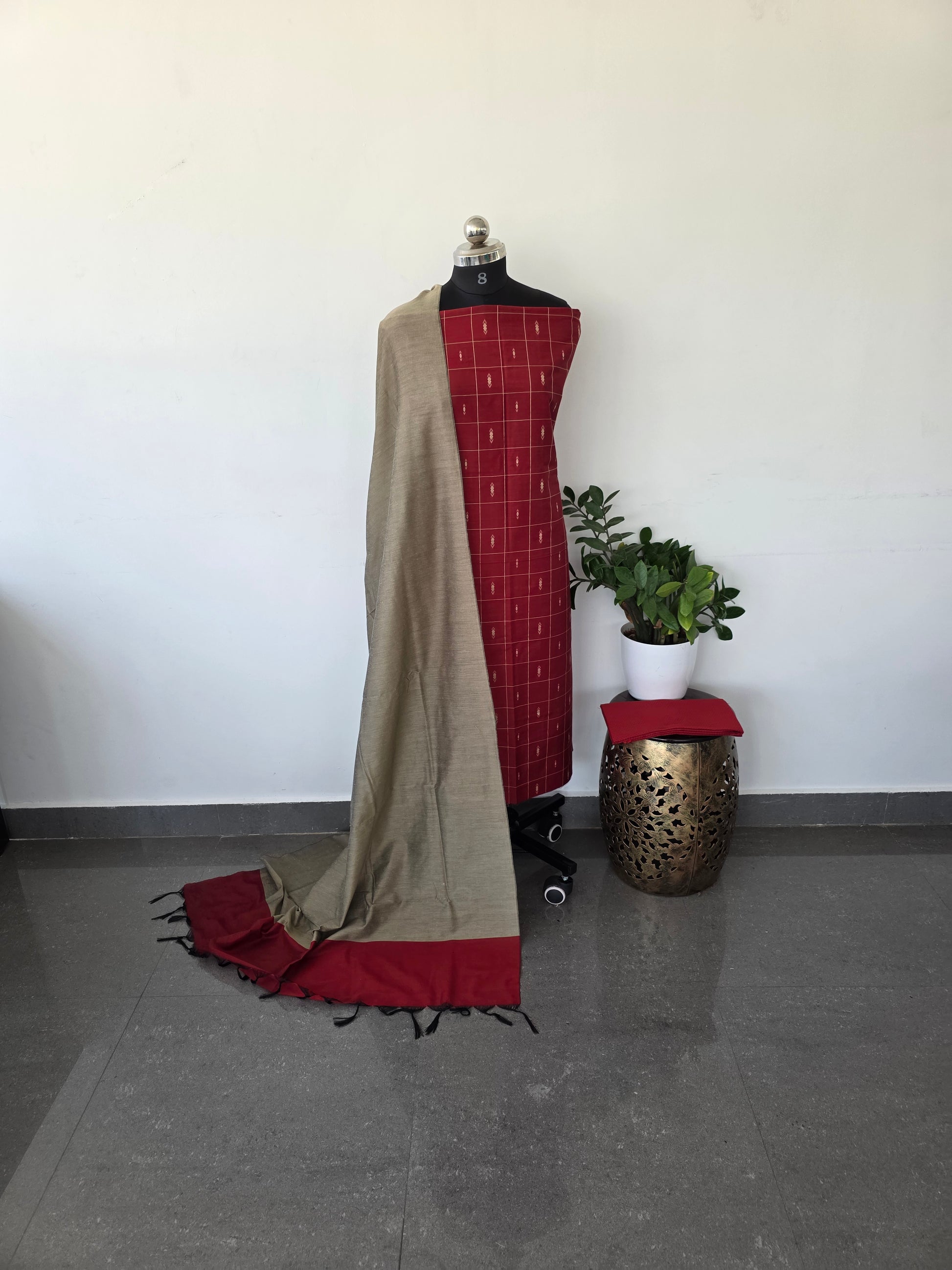 This set features a top crafted from soft silk with a zari jacquard weave in a checked design. The bottom is made of silk adorned with jacquard weaving, complemented by a soft silk shawl dupatta finished with tassels.