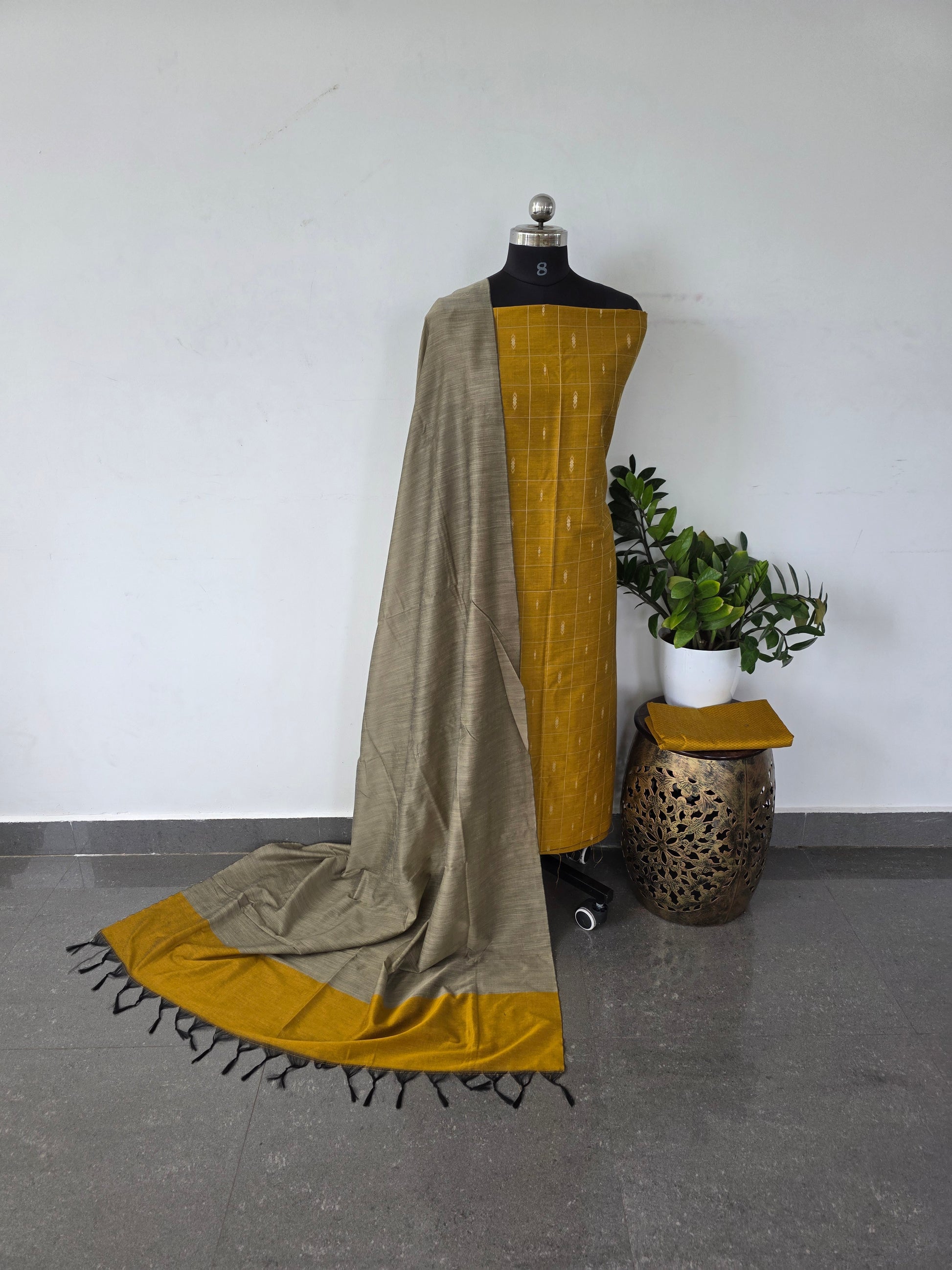 This elegant set features a top crafted from soft silk with a zari jacquard weave in a checked design. The bottom is made of silk adorned with jacquard weaving, complemented by a soft silk shawl dupatta finished with delicate tassels.