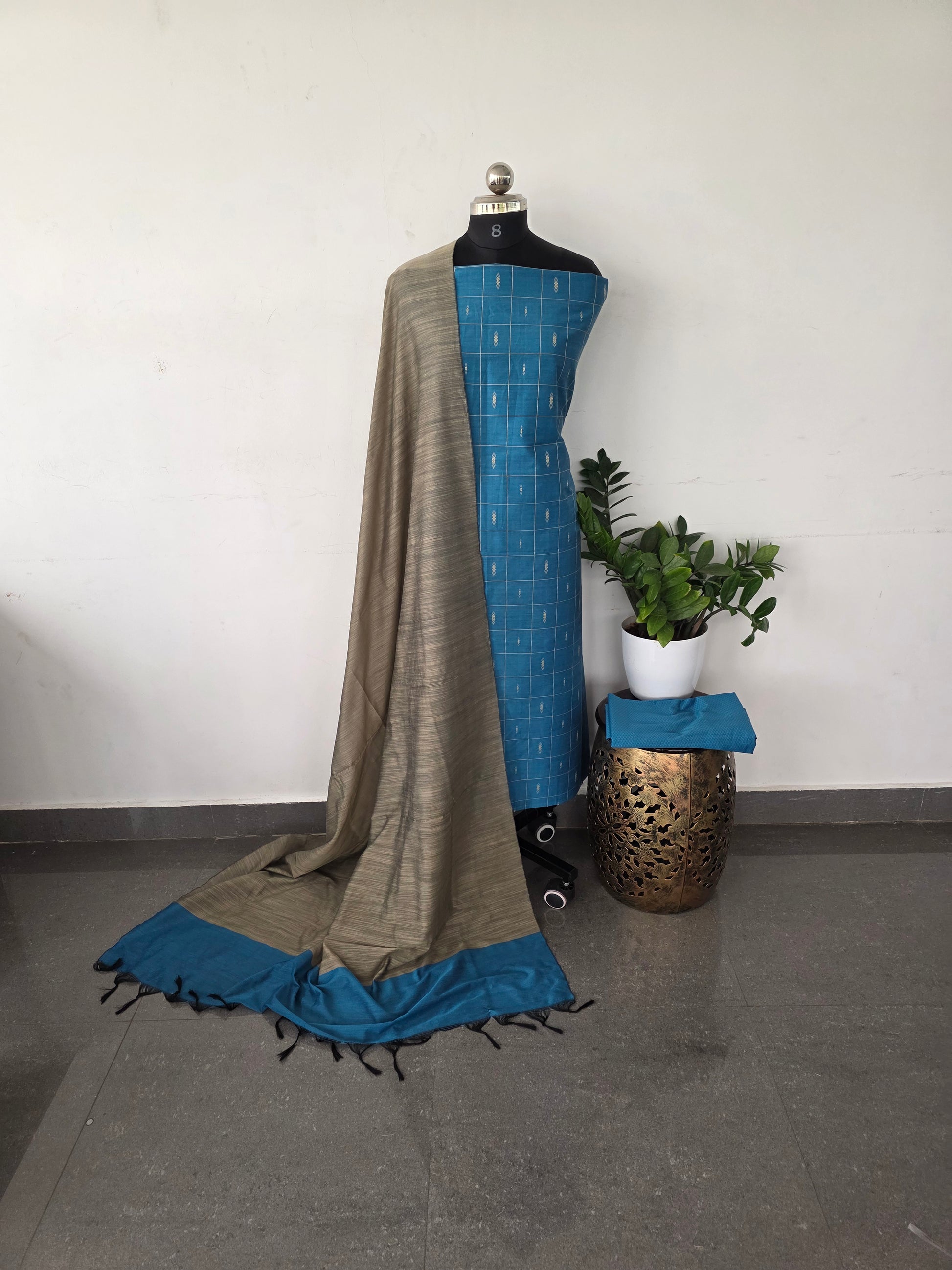 This set features a top crafted from soft silk with a zari jacquard weave in a checked design. The bottom is made of silk adorned with jacquard weaving, complemented by a soft silk shawl dupatta finished with tassels.