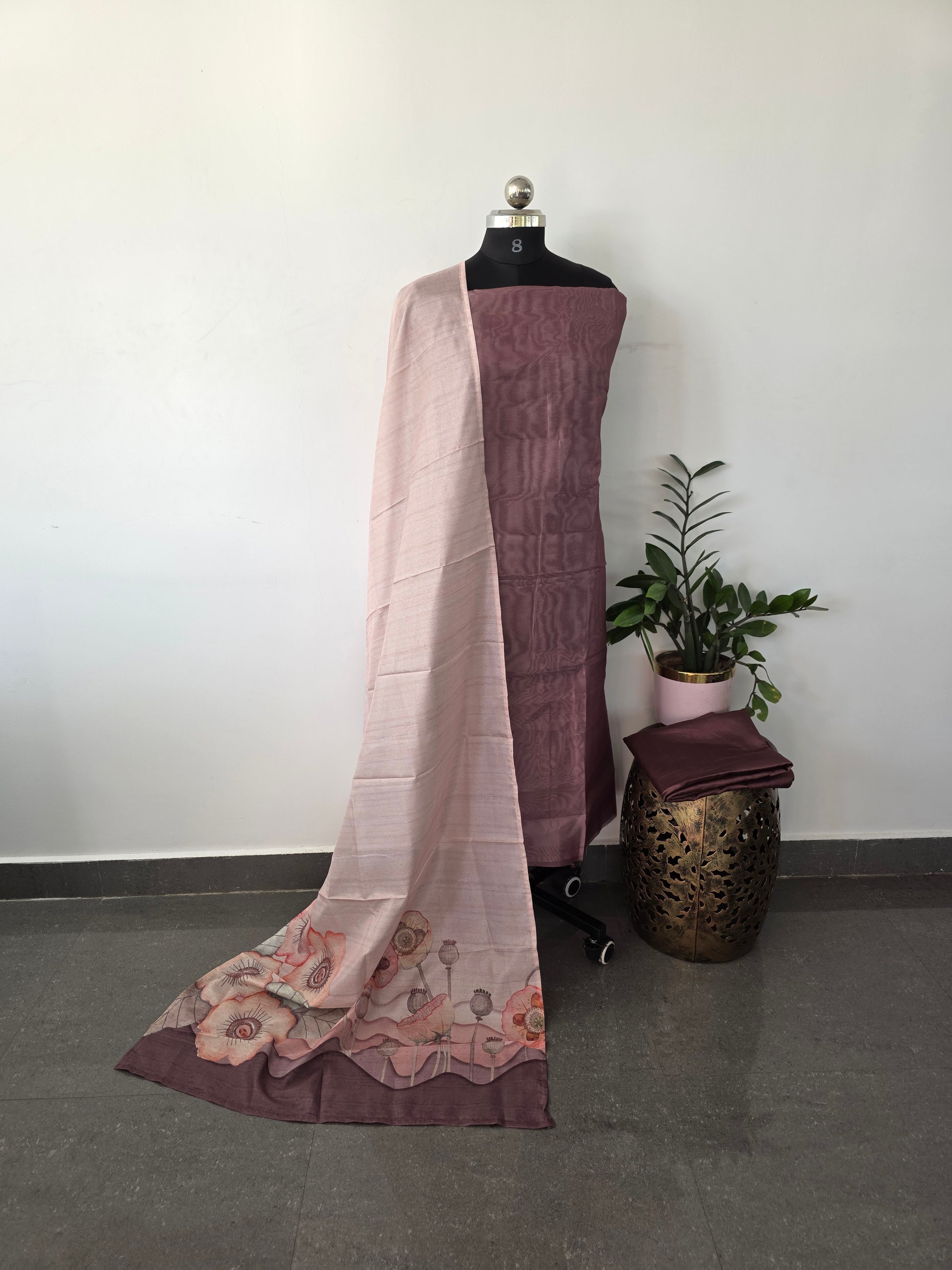 A refined ensemble combining delicate tissue for the top, lustrous silk for the bottom, and an elegant tussar duppatta. This three-piece set merges traditional craftsmanship with contemporary sophistication, offering versatile styling for both casual and formal occasions. The interplay of lightweight tissue and fluid silk creates a graceful silhouette, while the tussar duppatta adds textural depth and authentic handloom character.