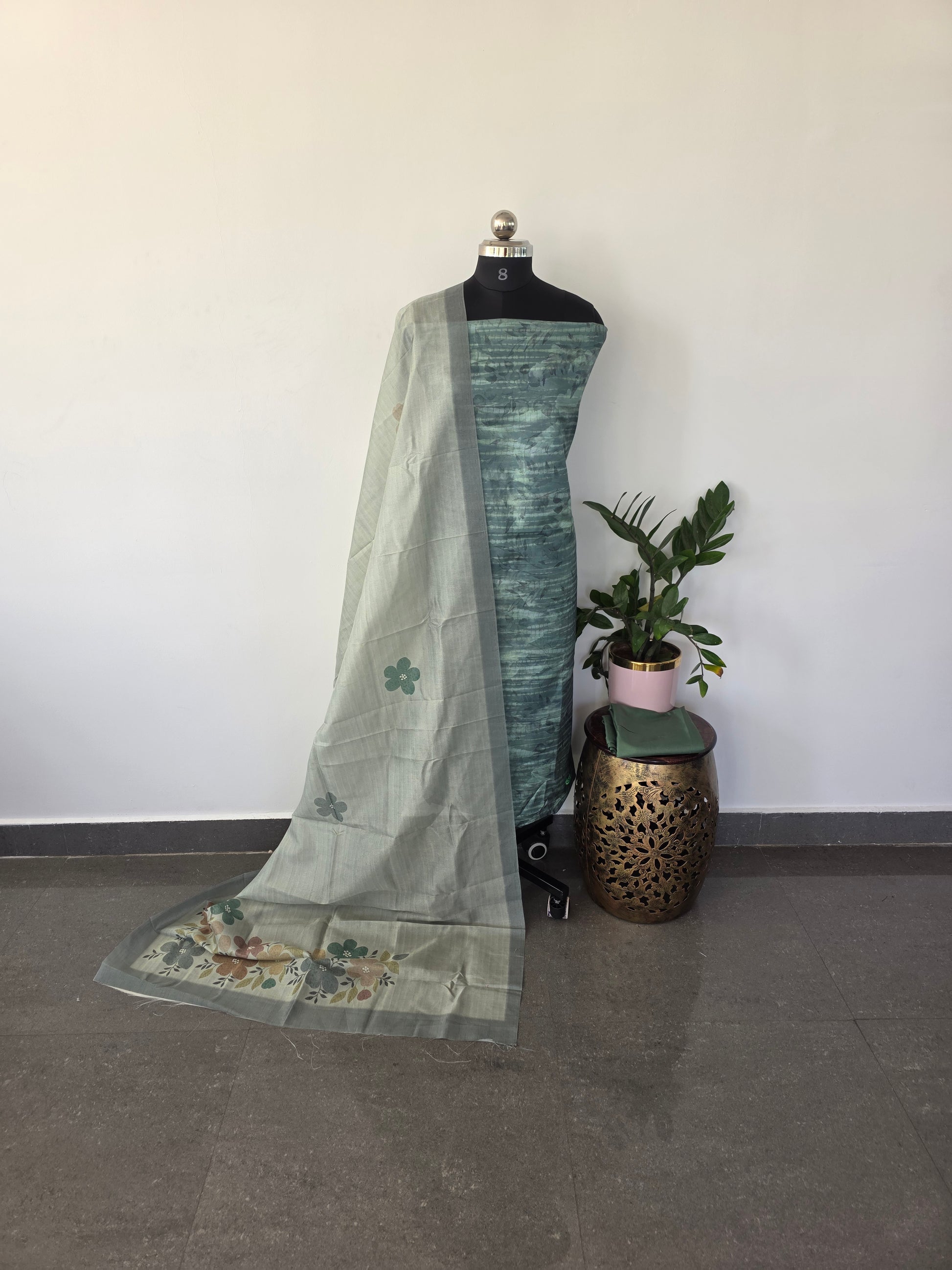 Ensemble featuring a tussar silk kurta paired with coordinating silk bottoms and a digitally printed tussar silk dupatta, creating a refined three-piece collection.
