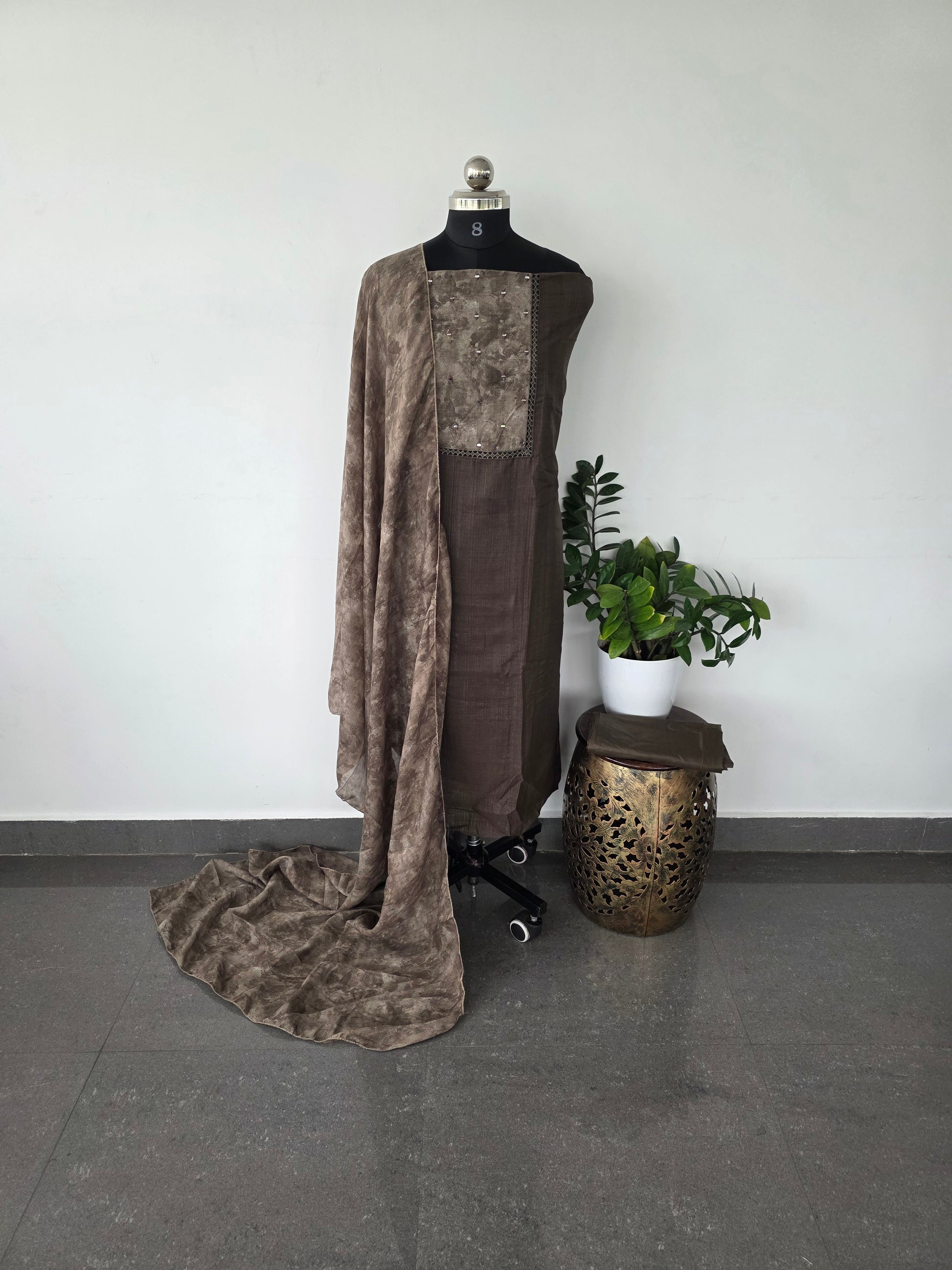This set features a Vichitra silk top adorned with a mirror yoke, paired with a silk bottom. It is completed by a Vichitra batik silk shawl, offering a refined and elegant ensemble.