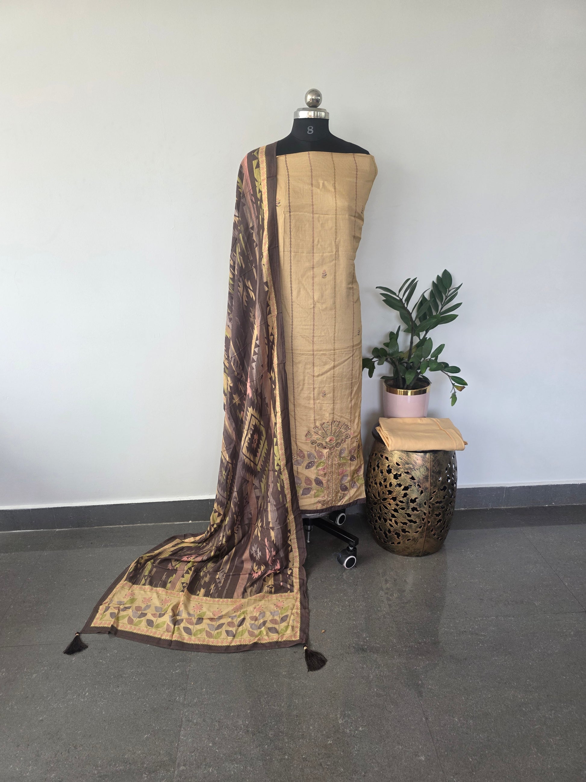 TOP: The top of this set is made of pure viscose muslin with digital print and features heavy aari and mirror work, as well as hand khatli embroidery.