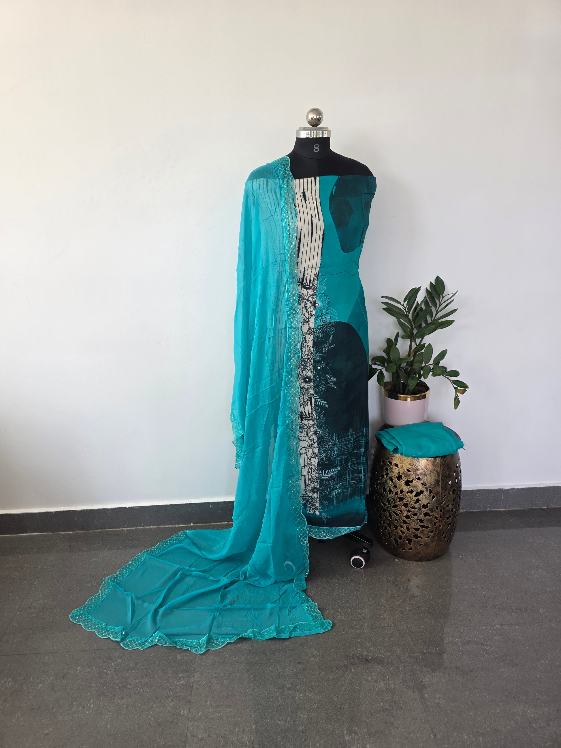 DUPATTA: The dupatta is crafted from pure bemberg material and is adorned with a stunning sequin border on all four sides, finished with organza detailing.